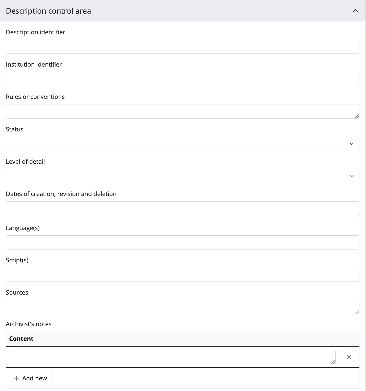 The control area is similar, with some variations, for archival descriptions (ISAD, DACS, and RAD templates only), authority records, archival institutions and functions. It contains fields that uniquely identify the description itself and records how, when, and by which archival institution the description was created and maintained.