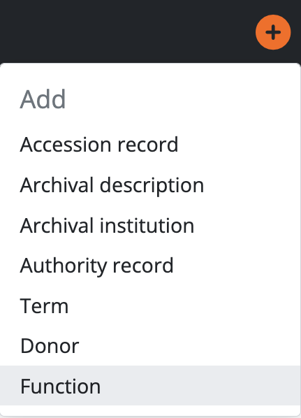 This section contains instructions on how to create a new function record in AtoM. Note that a user must be logged in to AtoM with sufficient access privileges to create new records. For more information on user permissions, see: User roles and Default user permissions settings in AtoM.