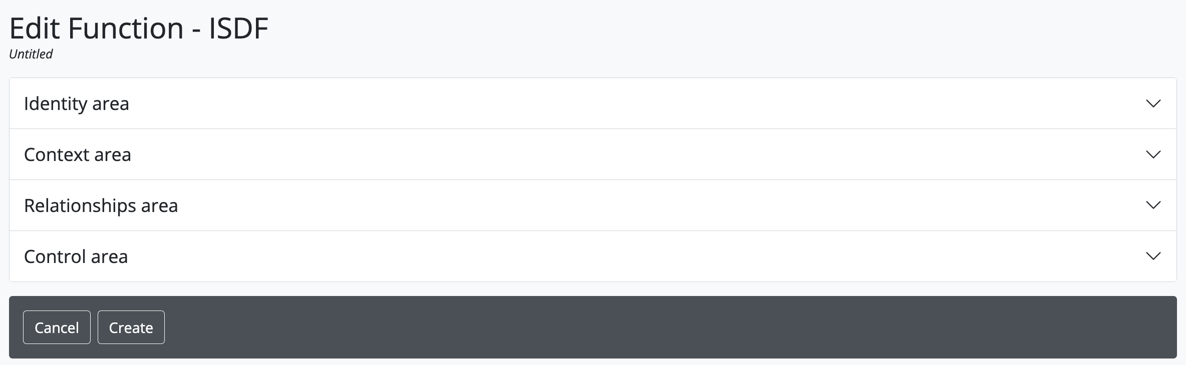 - To save the new function record, click the “Create” button in the button block at the bottom of the record. AtoM will redirect you to the function’s view page, so you can review your work.