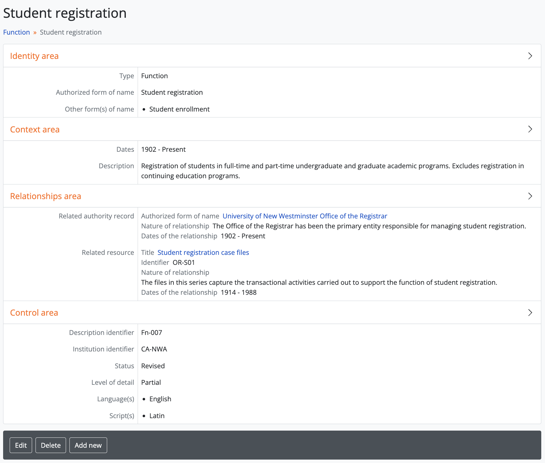 Consequenses of deleting a function: The function will be deleted permanently, and will also be removed from any related functions, archival descriptions, and authority records. (The related entities will not be deleted however).