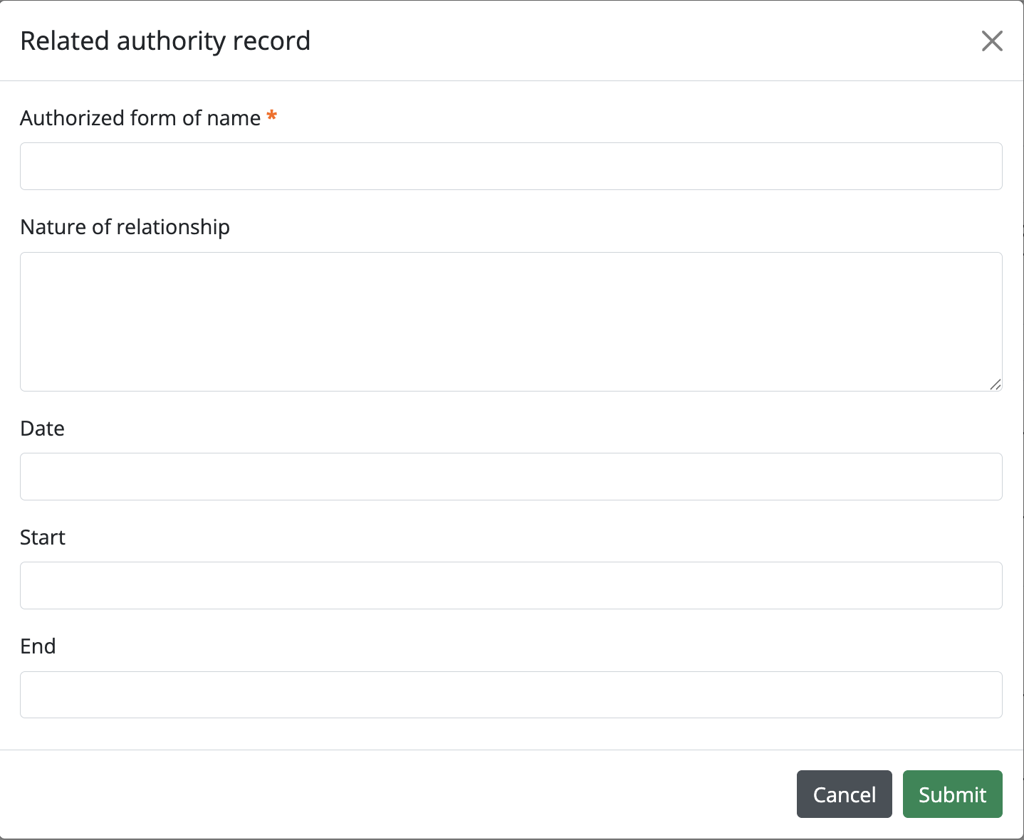 the Related authority records again - AtoM will open a new pop-up dialog.