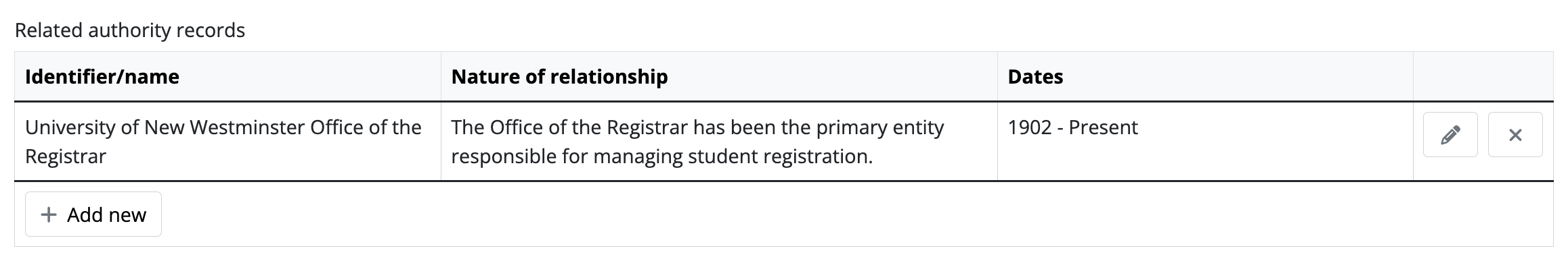 An example of a related authority record, as seen in the Relationships Area when in edit mode. Click “Add new” to create a new relationship.