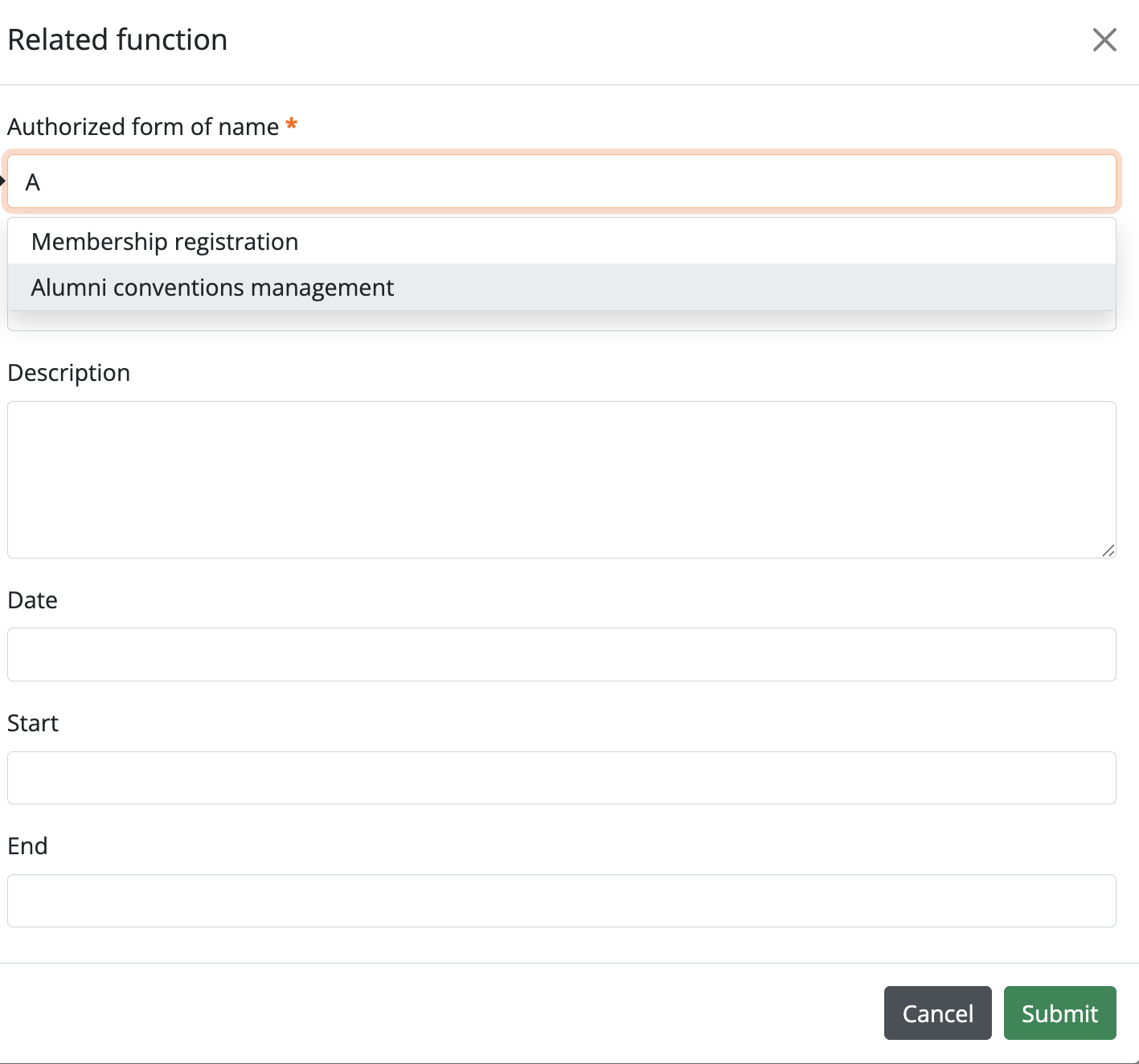 - AtoM will open a pop-up dialog where you can select the related function and define the nature and time frame of the relationship.