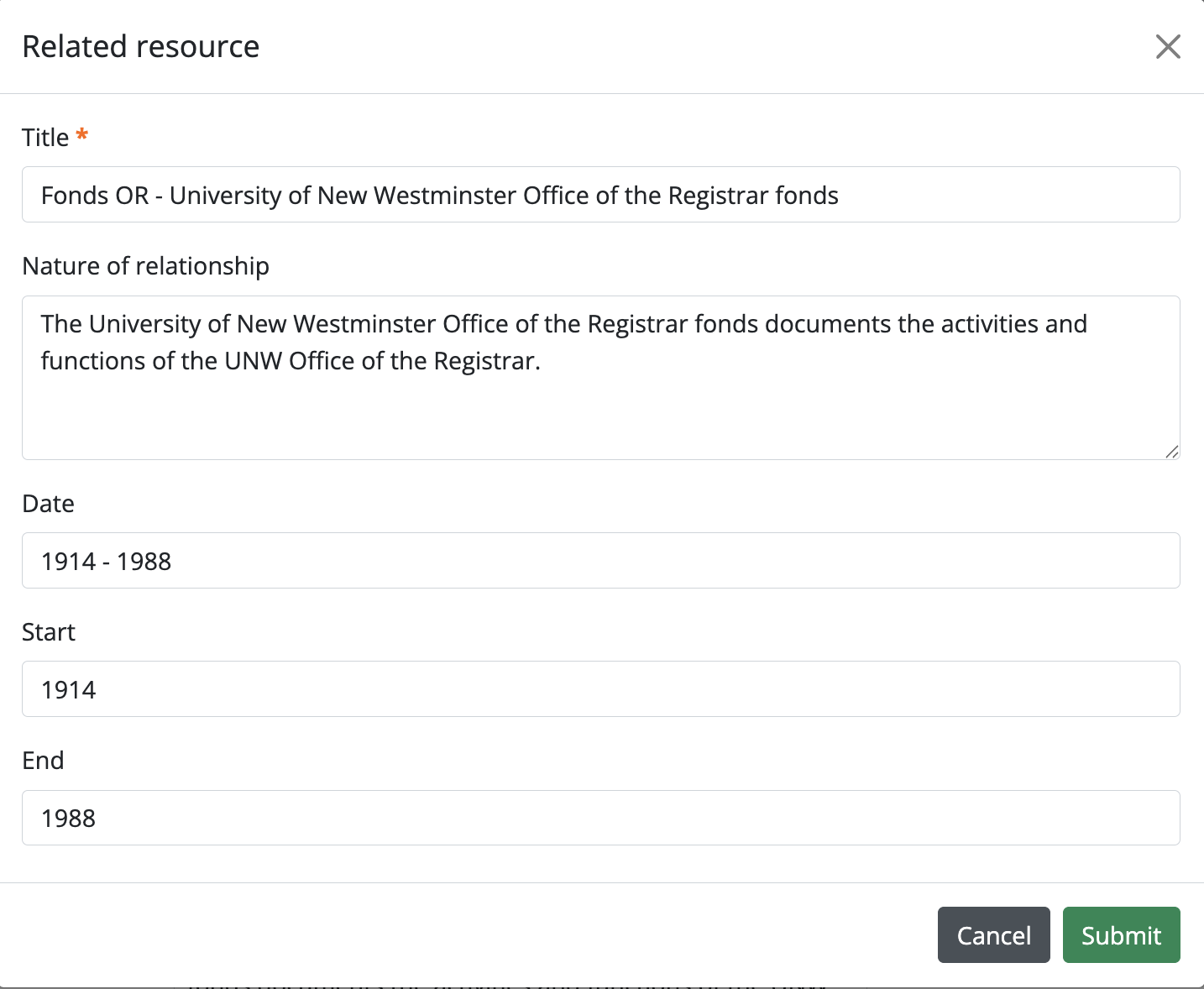 - AtoM will open a pop-up dialog where you can select the related archival description and define the nature and time frame of the relationship.