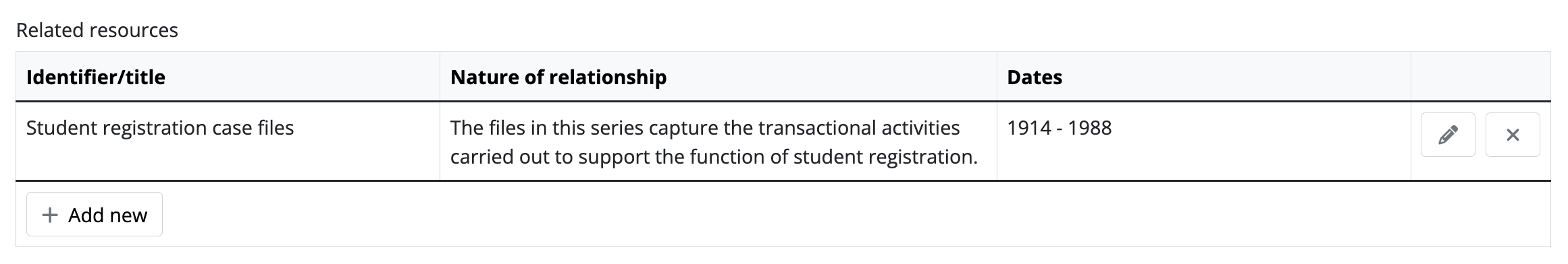 An example of a related archival description, as seen in the Relationships Area when in edit mode. Click “Add new” to create a new relationship.