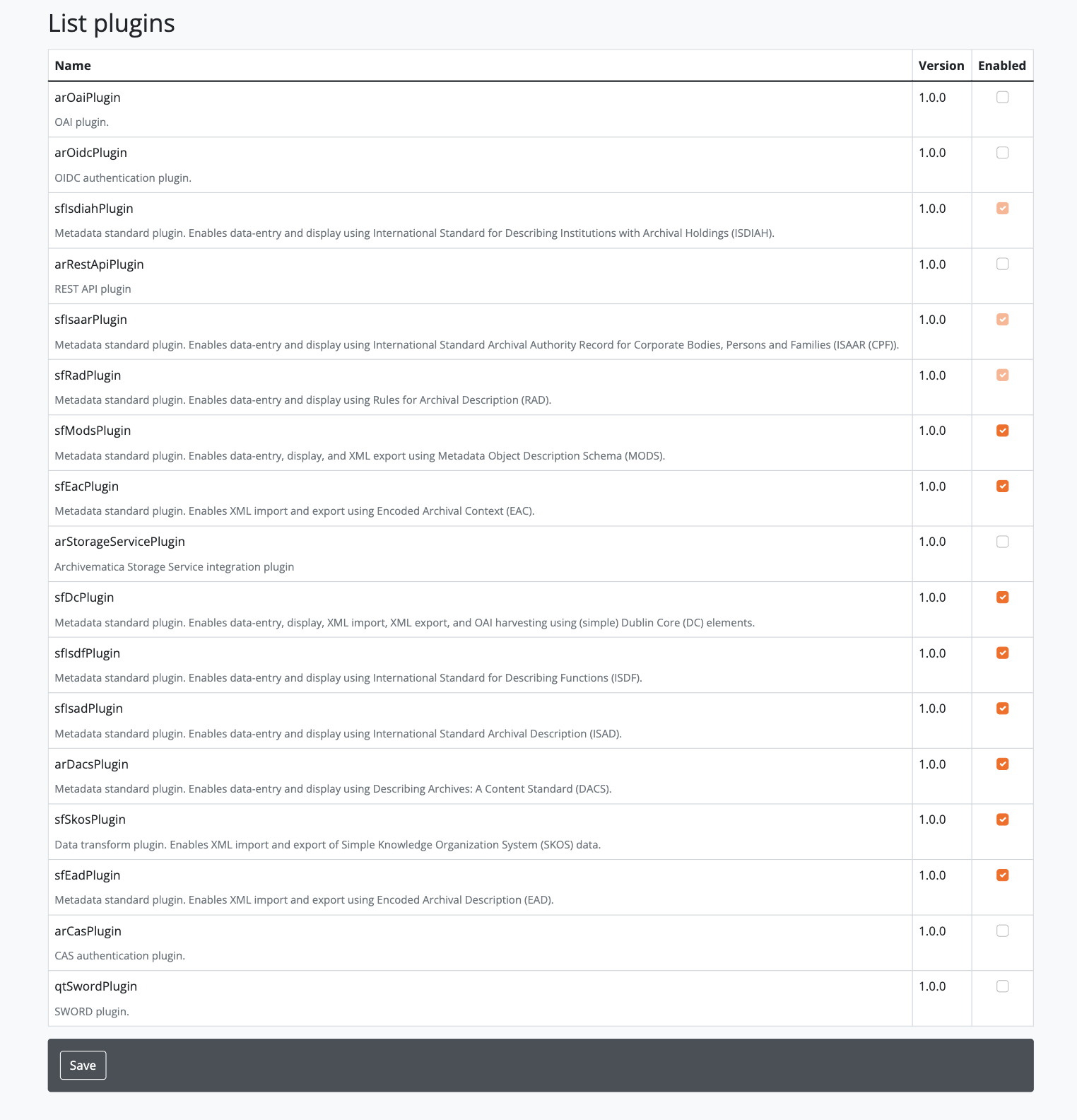 Most plugins based on ICA standards are permanently enabled in AtoM. These include the International Standard Archival Authority Record for Corporate Bodies, Persons and Families (ISAAR (CPF)), the International Standard Archival Description (ISAD) and the International Standard for Describing Institutions with Archival Holdings (ISDIAH).