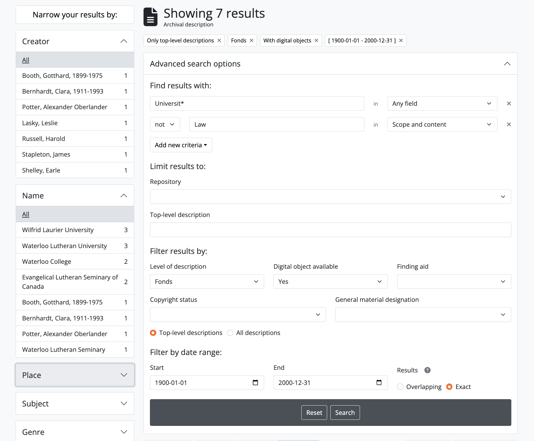 - If you wish to limit the results returned based on a search query before exporting, perform a search using the advanced search panel, and/or limit the results using the facet filters available in the left column. For more information on working with the fields and filters available on the advanced search panel, see: The Advanced search panel. For information on using the facets, see: Facet filters; particularly, Using facet filters in AtoM:.