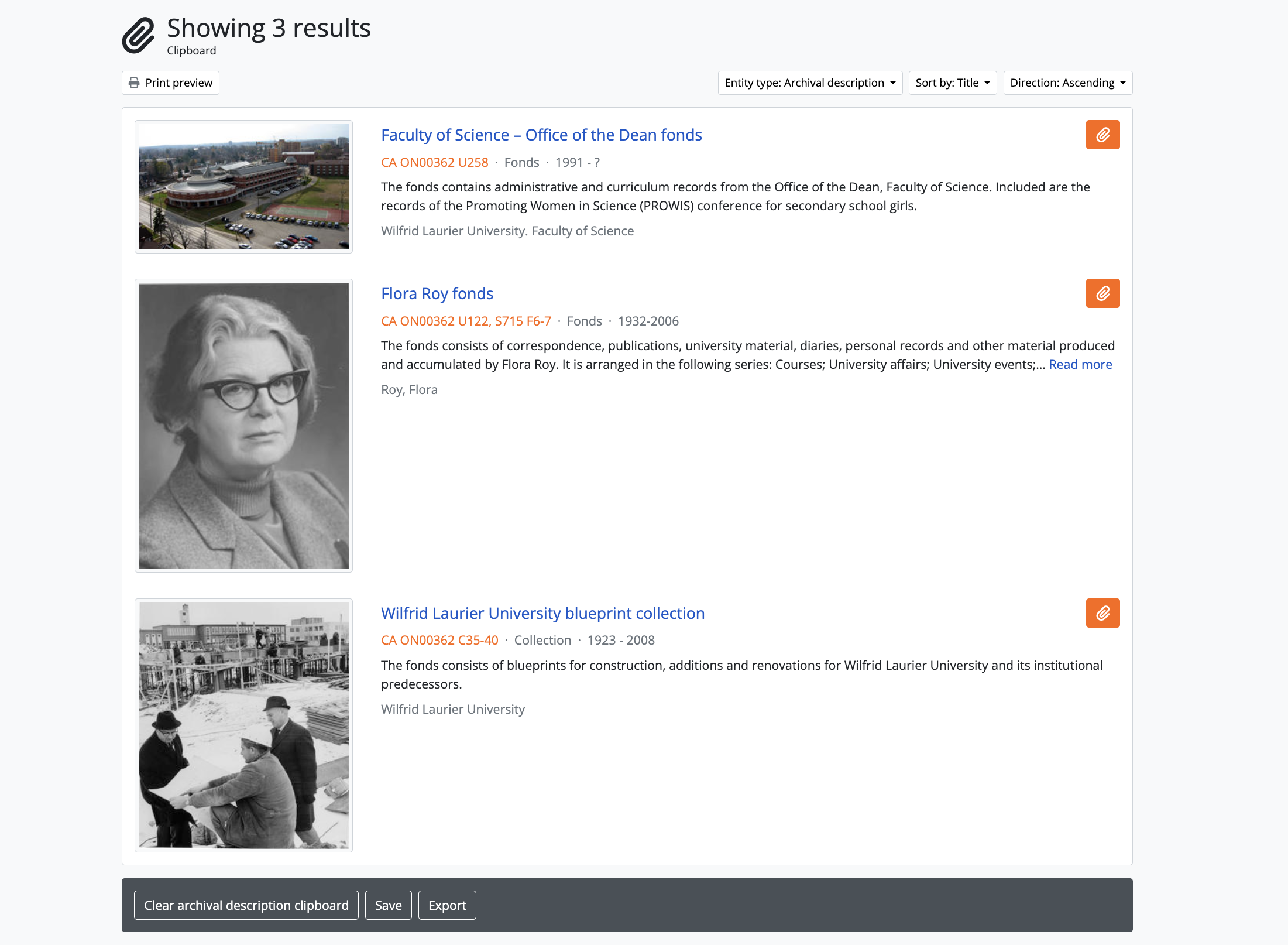 AtoM includes a clipboard that allows users to “pin” results to it for review or further action. For more information, see: Clipboard.