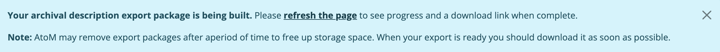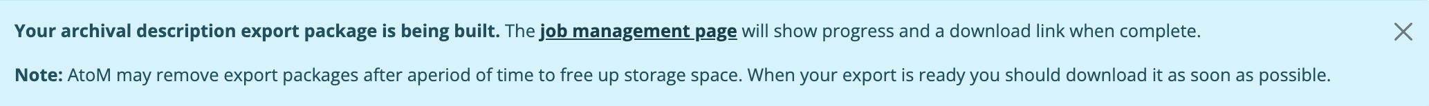 For public users, the download notification will remain visible as you navigate around AtoM until you click the “X” to remove the notification.