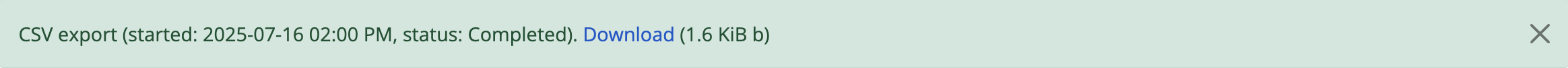 For public users, first a notification that the job has been initiated will be displayed, with a link that will refresh the page to see if there are updates. Users can use the X icon on the right of the notification to remove it. You can now navigate elsewhere in the application - another notification will be provided when the export is complete and ready for download.