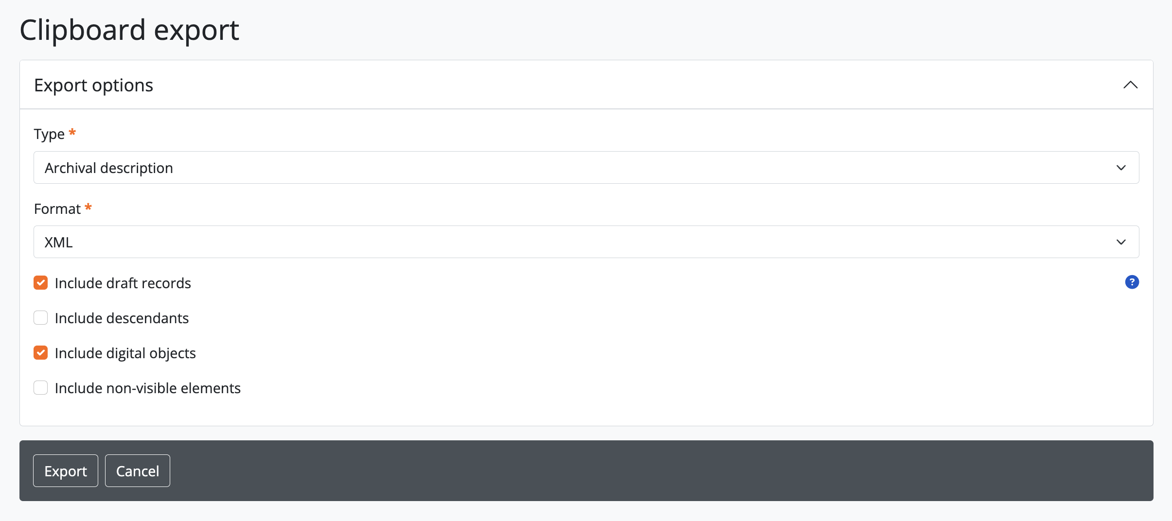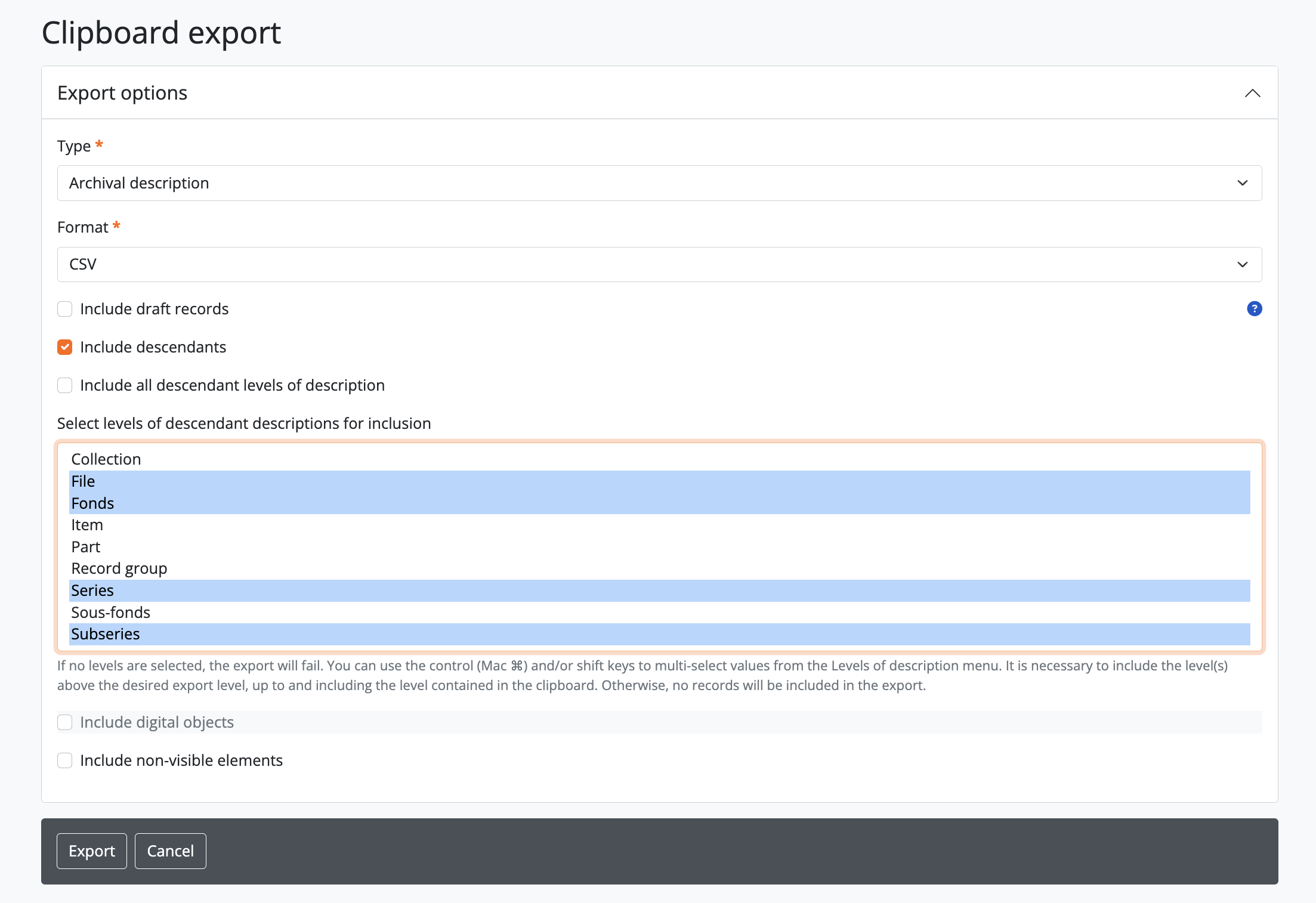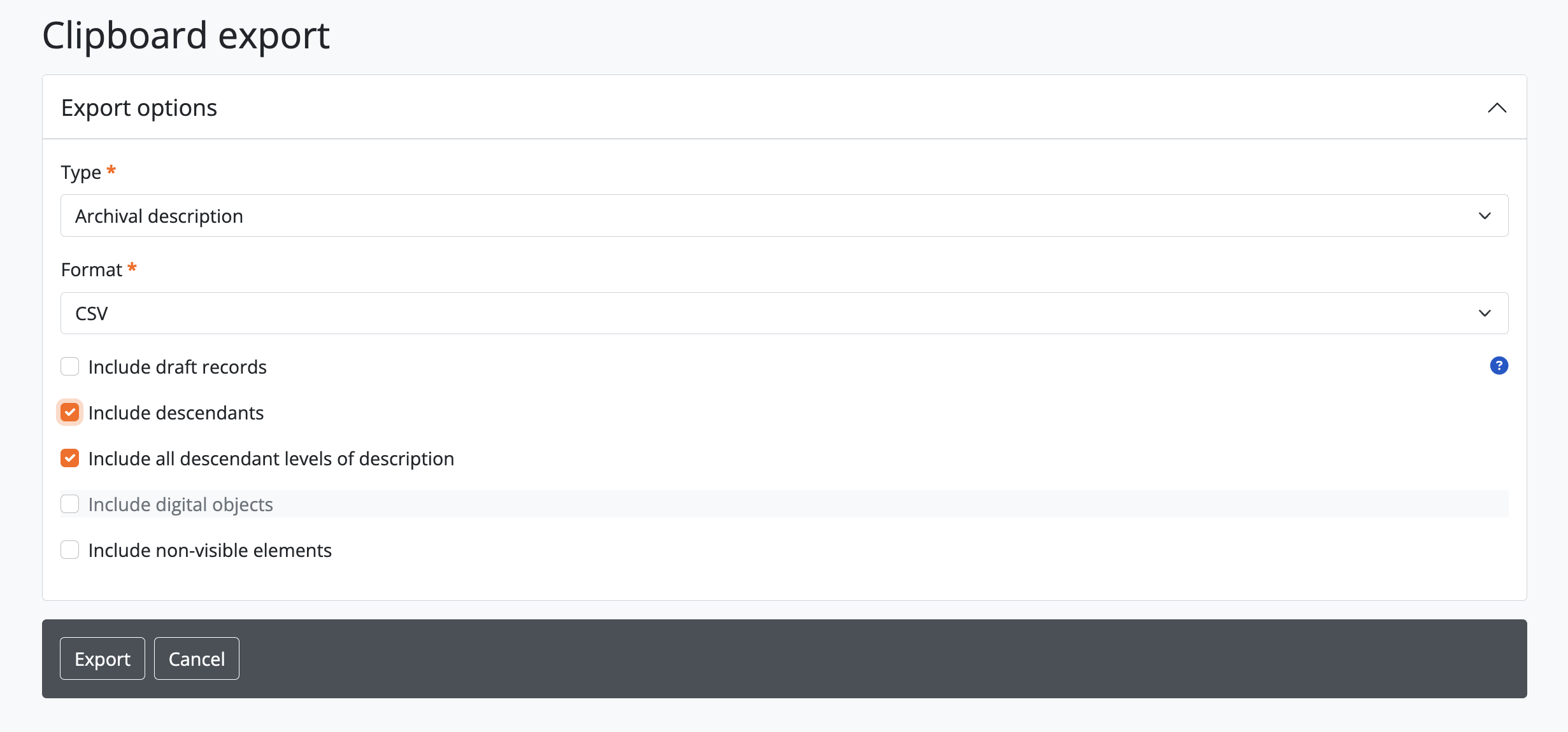 Note that if the “Include digital objects” checkbox is checked, it is no longer possible to include descendants in the export, and the “Include descendants” checkbox will be greyed out. This means you will need to individually add the descriptions with digital objects to the clipboard if you want to export them, rather than just adding a parent description.