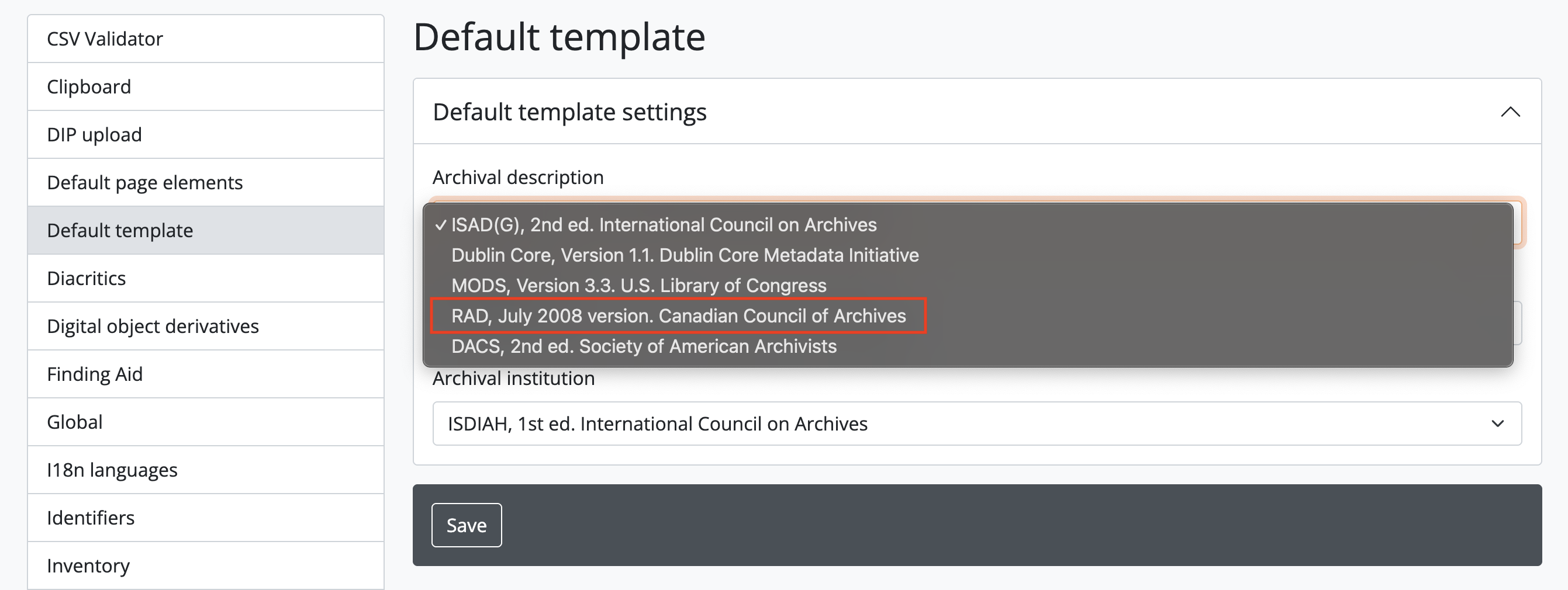Once you are in the ‘Settings’ menu, on the left hand side, select ‘Default template’ and there you will find three options: Archival description, Authority record and Archival institutions. Go to the ‘Archival description’ and from the dropdown menu select: ‘RAD, July 2008 version. Canadian Council of Archives’: