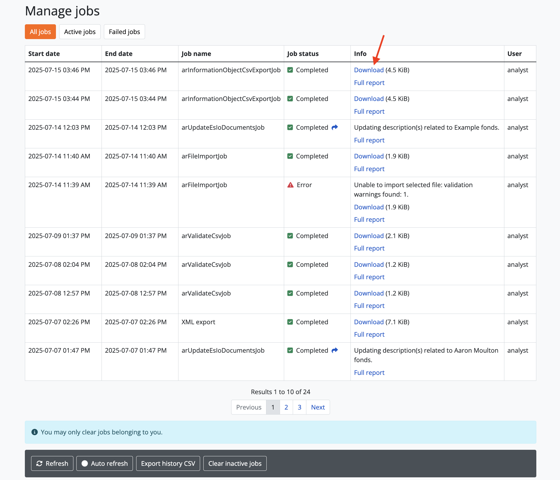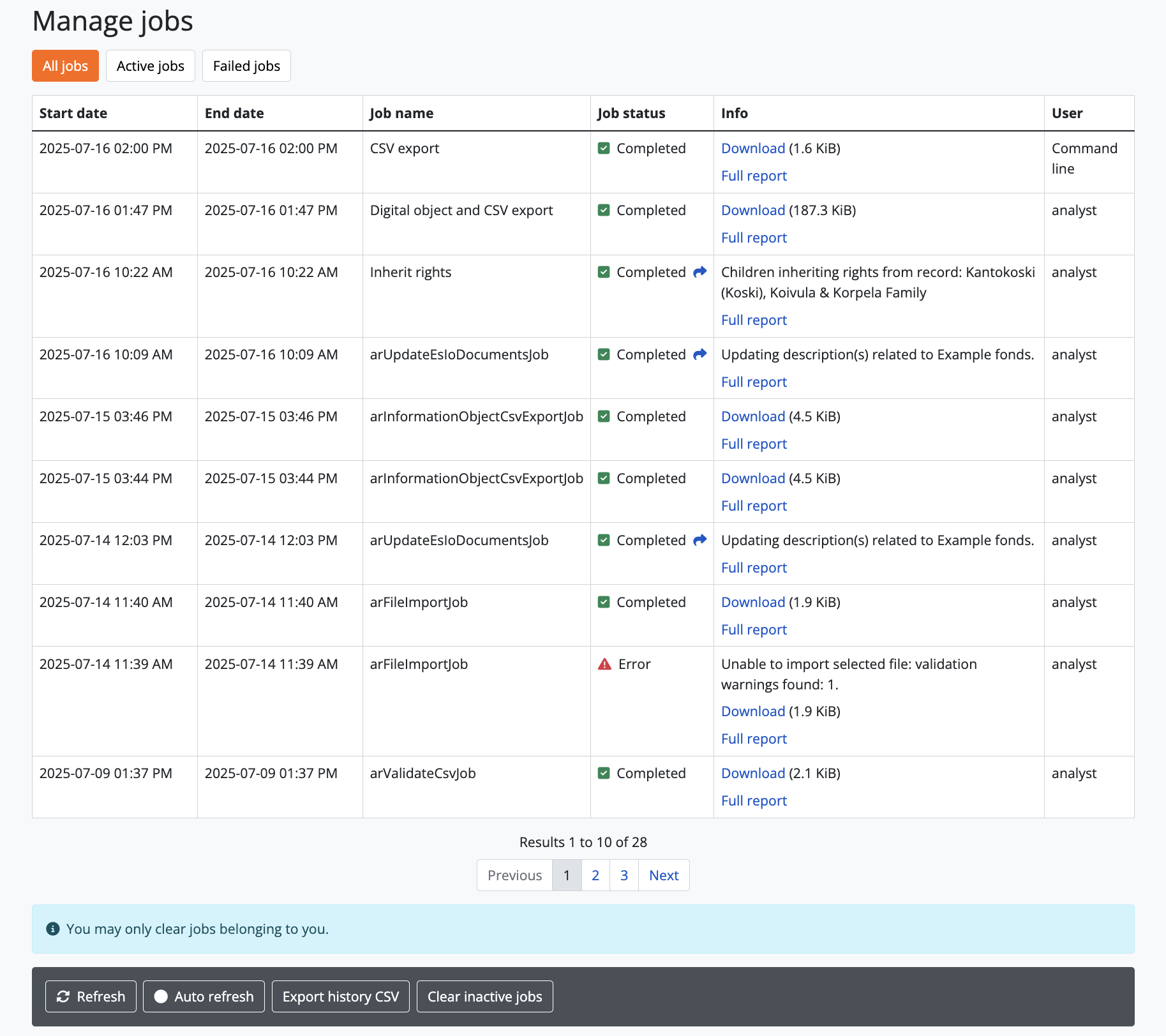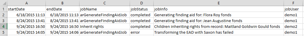 In case users would like to clear completed jobs but keep a record outside of AtoM of previous jobs performed, a CSV export of the Jobs table is available. Like the display table in the user interface, the output contains columns for startDate, endDate, jobName, jobStatus, jobInfo, and jobUser.