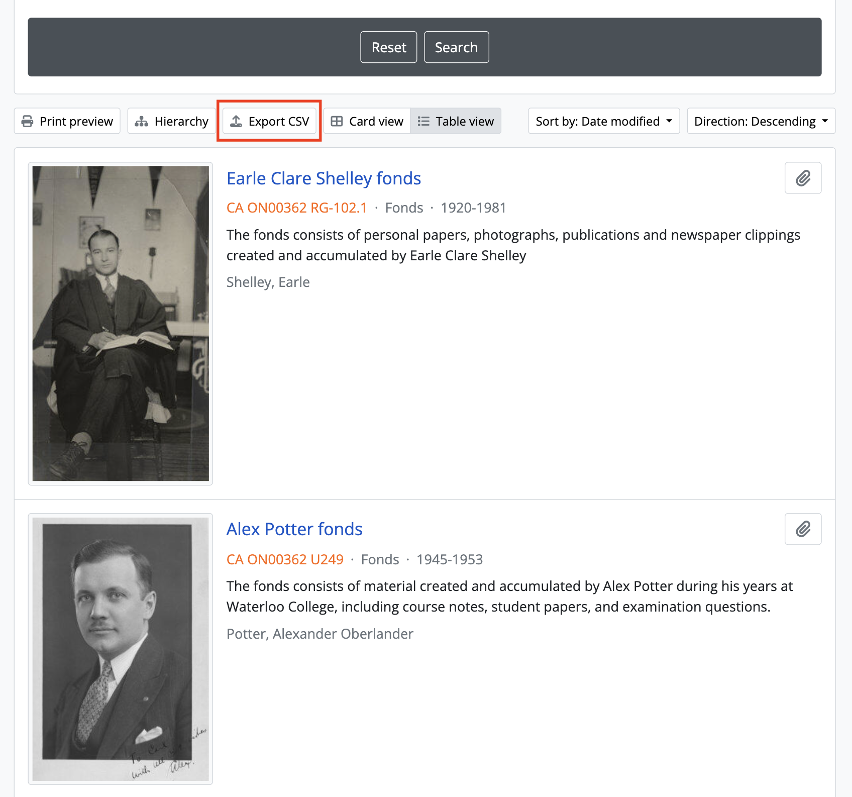 Any authenticated (i.e. logged in) user can generate a CSV export of archival description Search or Browse results. The CSV export, after it is generated, is made available for download from the jobs page.
