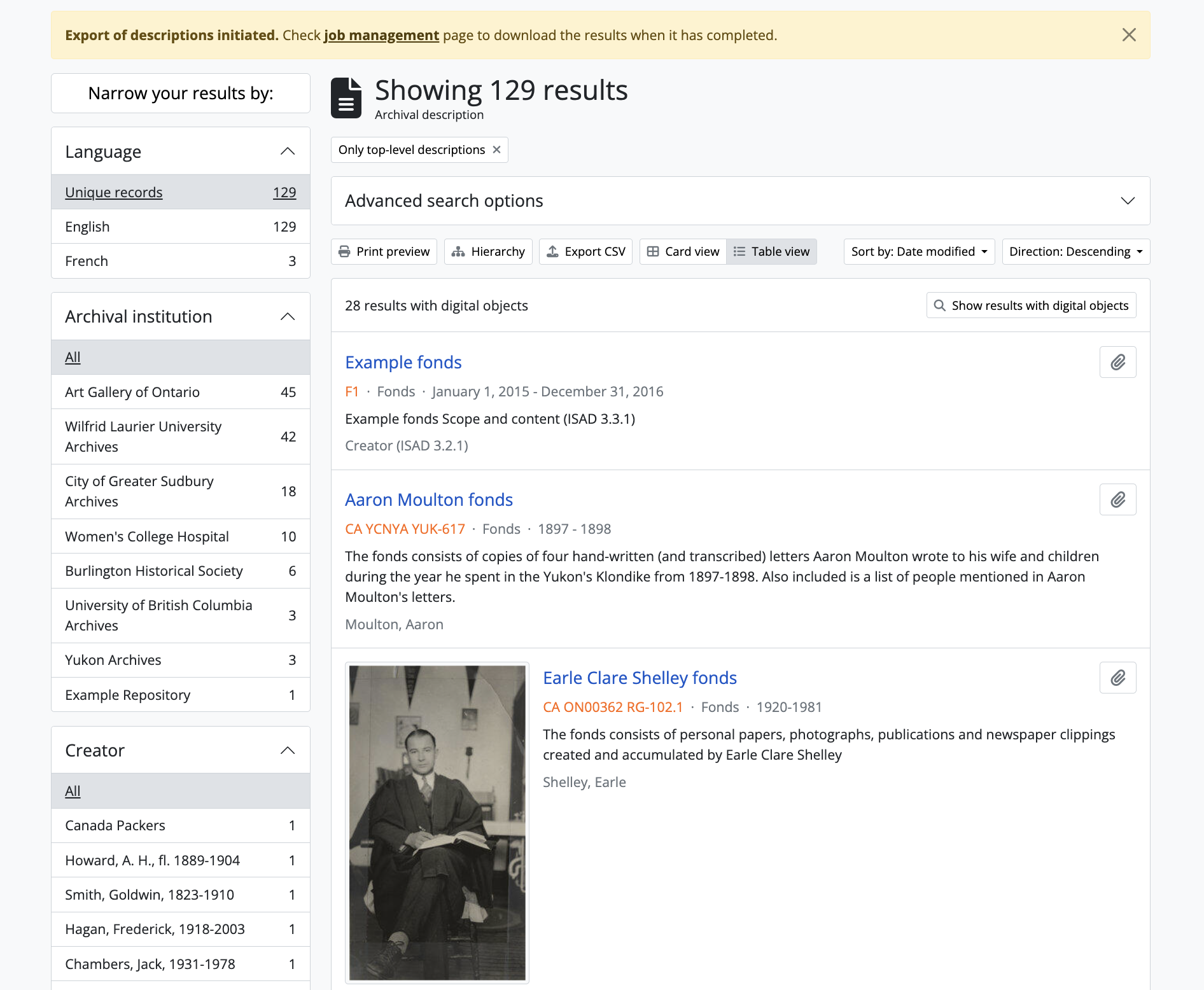 - The CSV export of the search results will be generated by the job scheduler. After clicking the “Export CSV” link, AtoM will reload the page - scroll back up to the top to see a notification about the job, with a link to the jobs page where you can see the status of your job and download the CSV when it is ready. Click on the link in the notification to go to the jobs page.