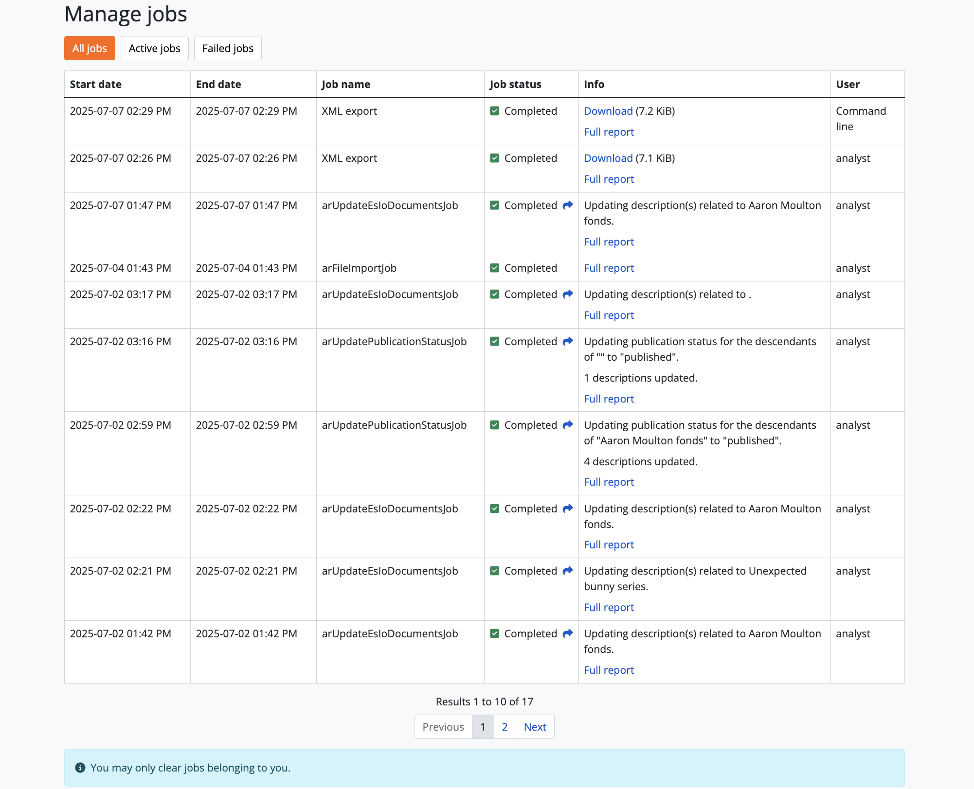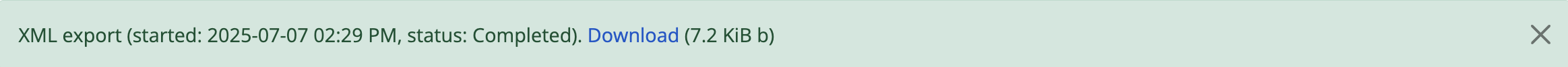 On the jobs page, authenticated users will find information about the export job, including a download link when the task is done. Check the “Job status” column - if it says “Completed,” then the job has successfully finished and you can now download your ZIP file of the XML exports. If it says “Running,”then the task is still being executed - try refreshing the page in a moment for an updated status. If the Job status column says “Error,” then the XML export has failed for some reason - talk to your system administrator for assistance. See the Manage jobs page for more information.