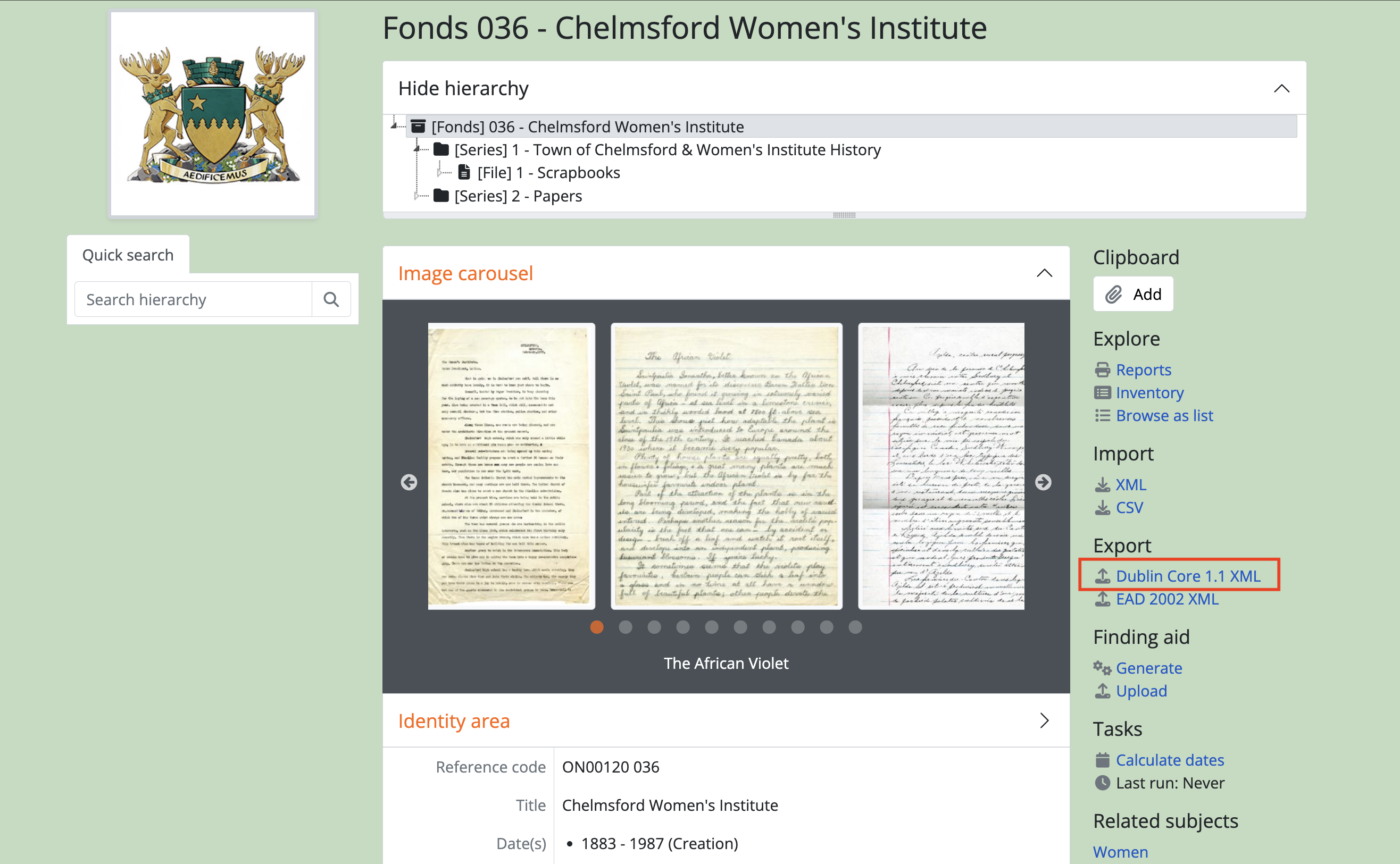 - Navigate to the archival unit you wish to export. You can do this by browsing or searching for the archival description - see Access content for more information on navigation in AtoM.