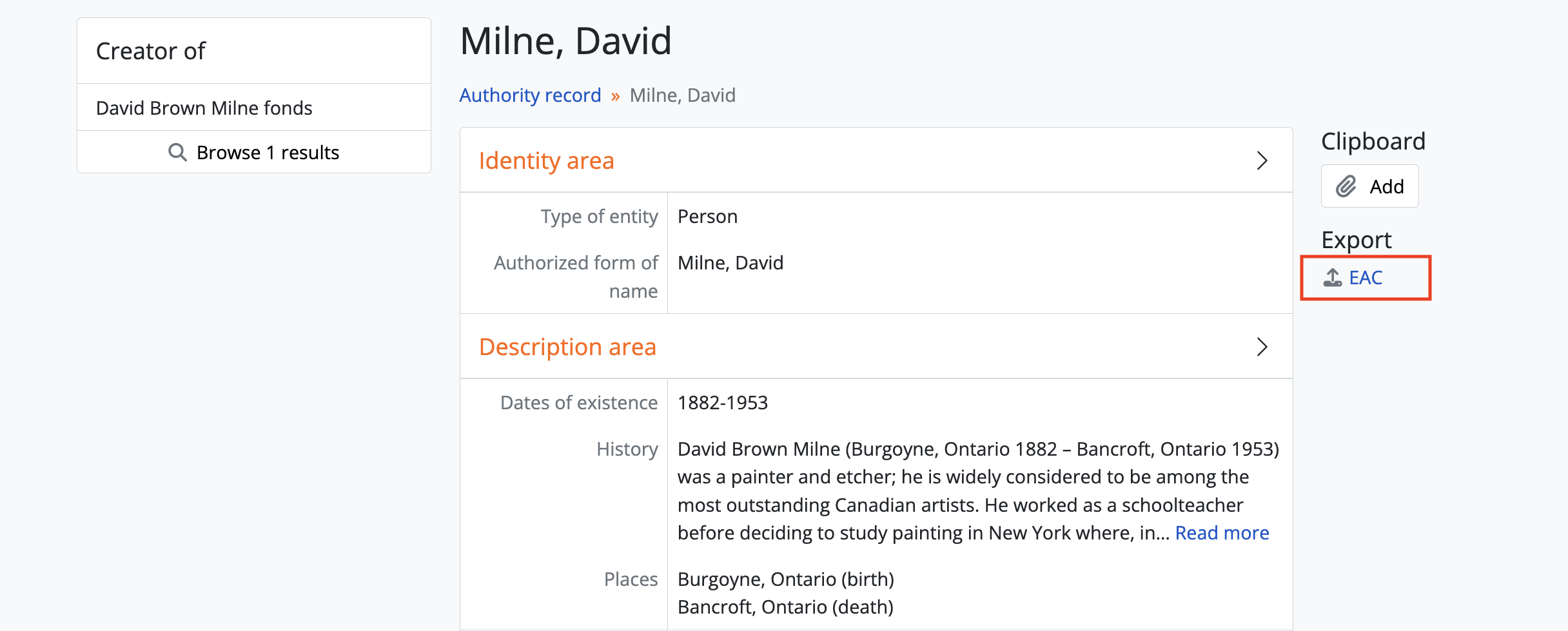 - Navigate to the authority record you wish to export. You can do this by browsing or searching for the authority record - see Access content for more information on navigation in AtoM.