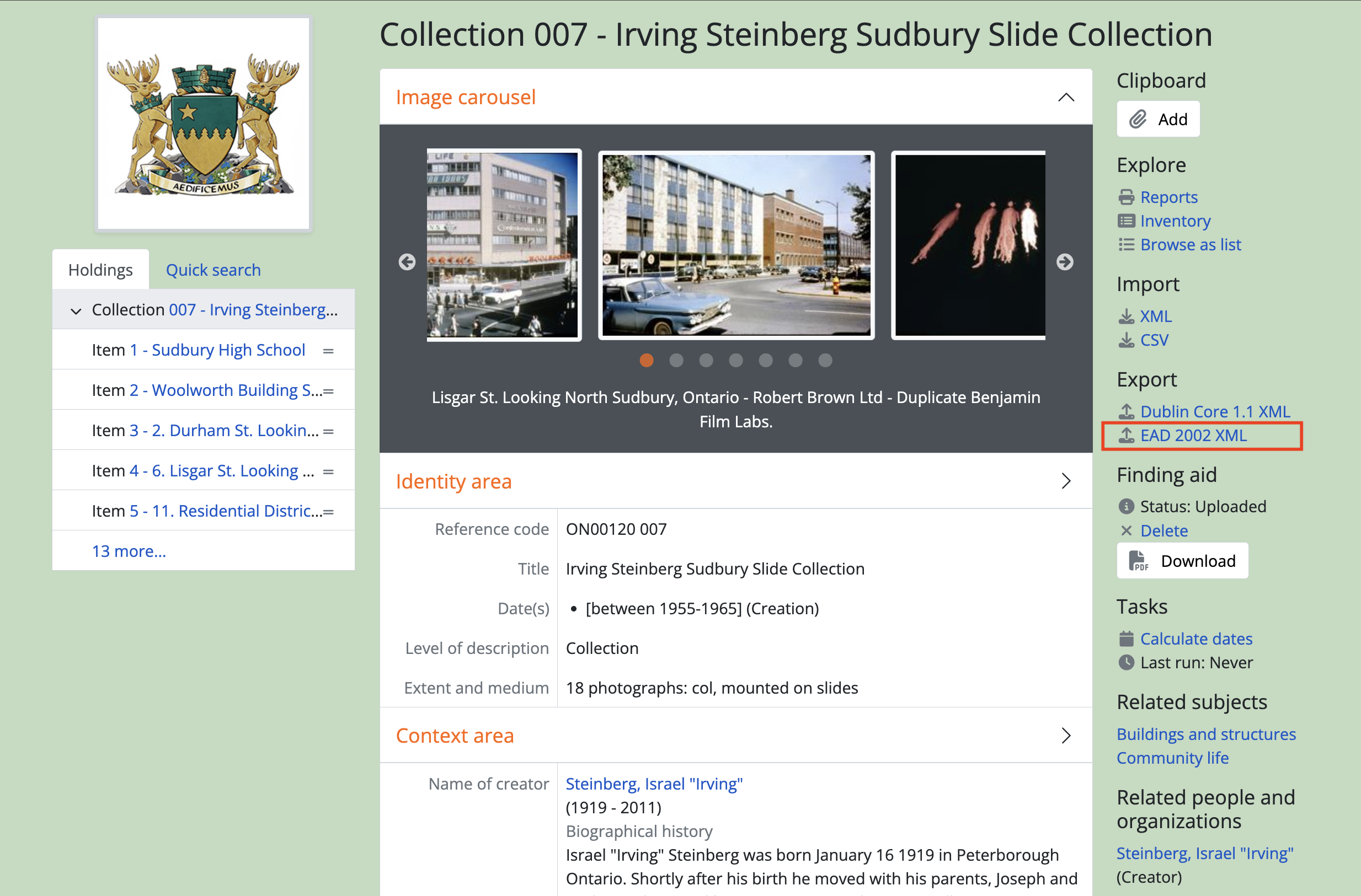 All users can export EAD 2002 XML from the view page of an archival description, via the export links available in the right-hand context menu. For more information on the context menu and archival descriptions, see Context menu.