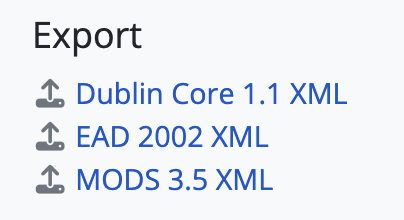 - Dublin Core XML, MODS XML (individual archival descriptions)