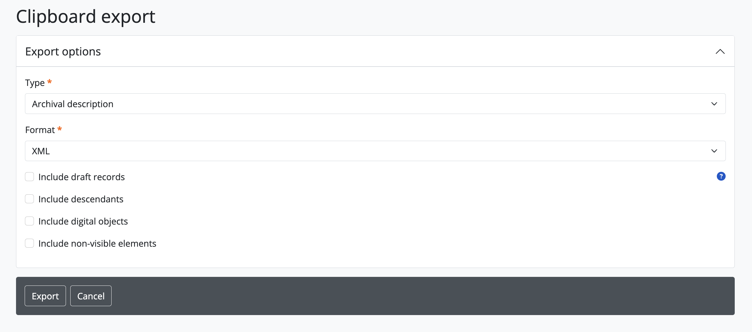 Note that if the “Include digital objects” checkbox is checked, it is no longer possible to include descendants in the export, and the “Include descendants” checkbox will be greyed out. This means you will need to individually add the descriptions with digital objects to the clipboard if you want to export them, rather than just adding a parent description.