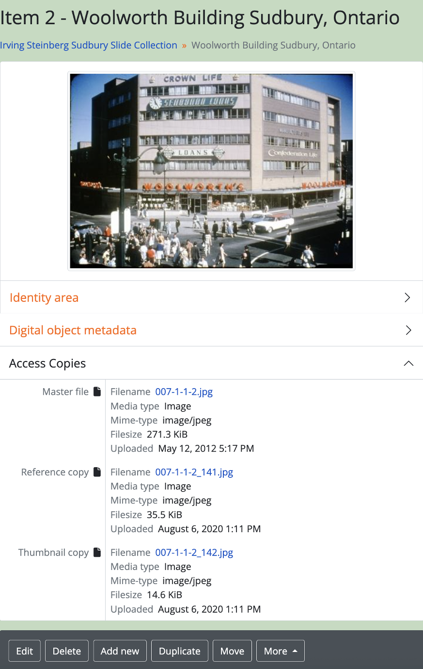 The “Access Copies” subsection will include metadata about the “Master file”, “Reference copy”, and “Thumbnail copy” representations of the digital object. Specifically: filename, media type, mime-type, filesize, and uploaded (the timestamp for when the digital object was uploaded to AtoM).