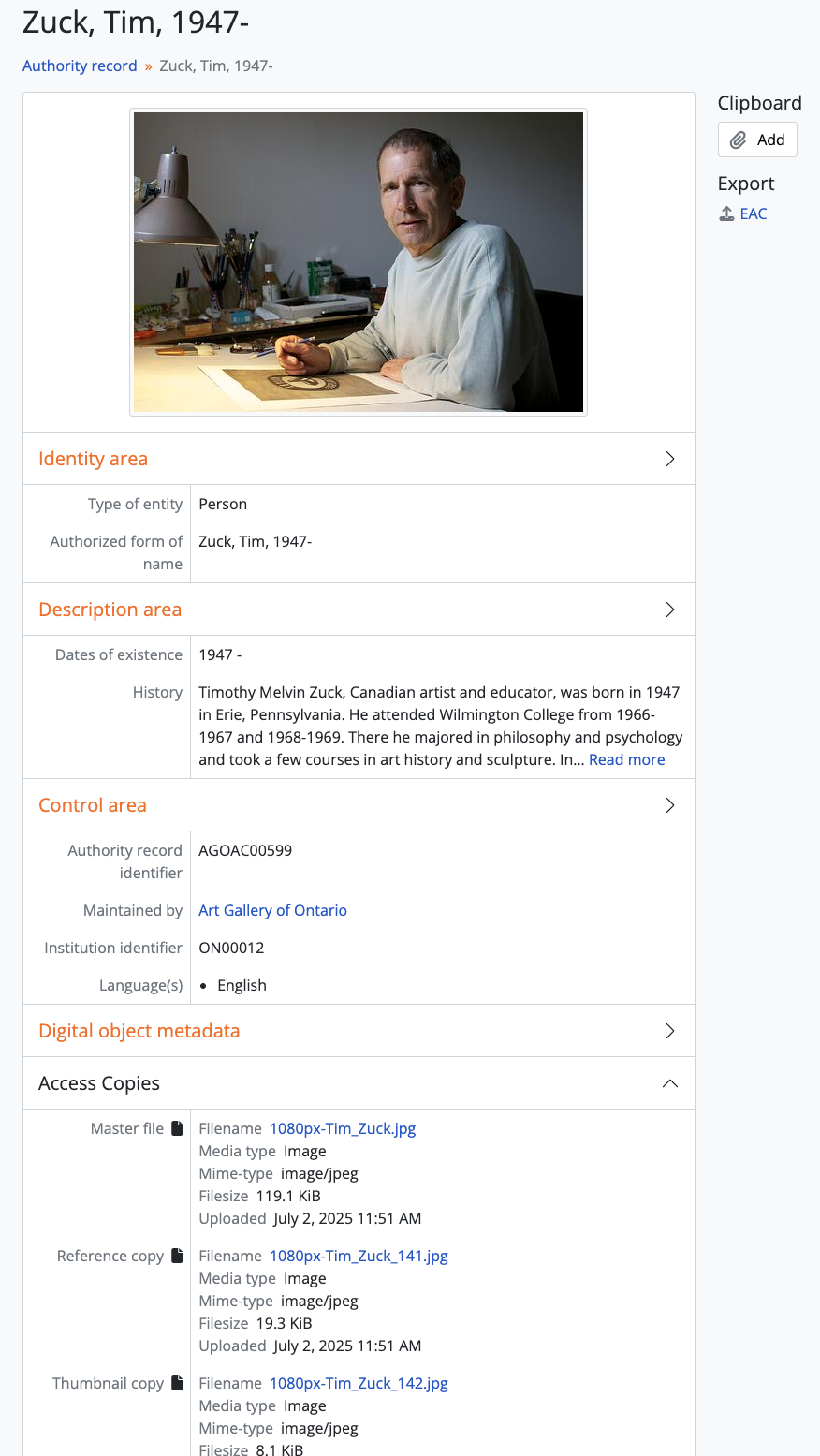 When the preservation system uploads a DIP with digital objects to AtoM, it will generate “Master file”, “Reference copy”, and “Thumbnail copy” representations with their metadata displayed in the “Access copies” subsection.