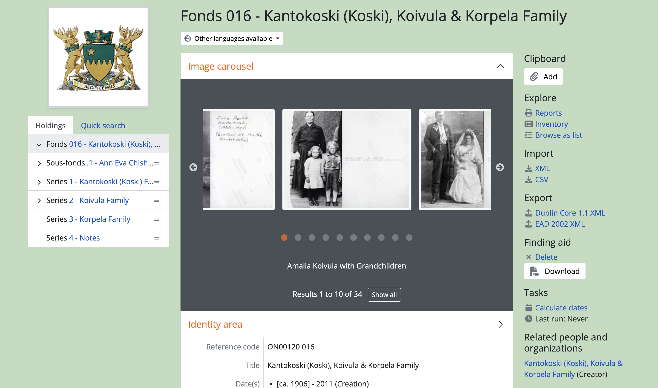 At higher levels of description, the view page of a parent record will include thumbnails of all digital objects registered at lower levels. The thumbnails are displayed using a carousel viewer so you can easily scroll through the set using your mouse or keyboard’s arrow keys. Clicking on a thumbnail will redirect you to the view page for the description associated with that digital object. If more than 10 digital objects appear at lower levels, AtoM will display the first 10 in the carousel and provide a link to a digital object browse page to explore the rest if desired. For more information, see the Carousel entry in Navigation in AtoM.