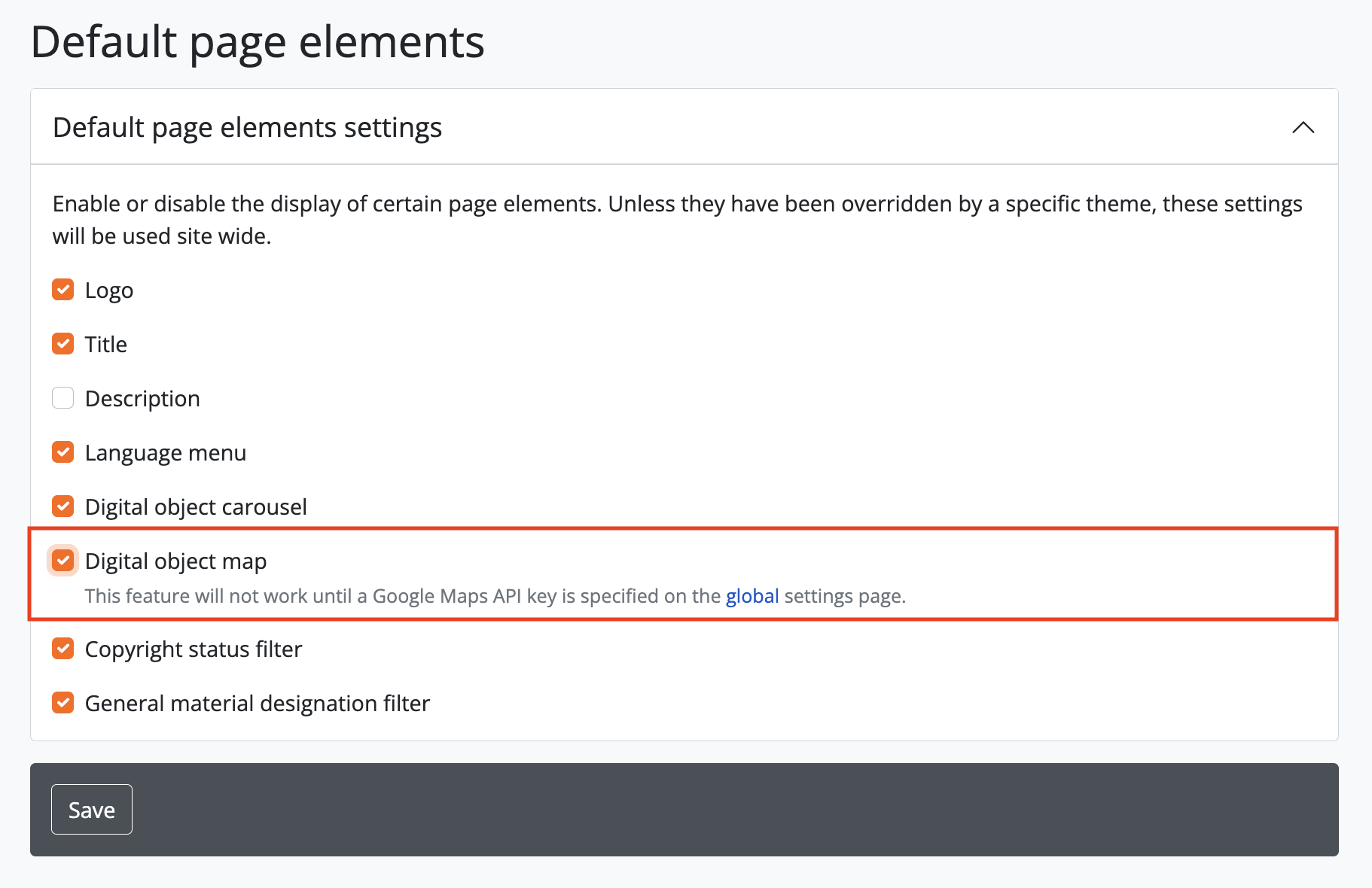 Additionally, in Admin > Settings > Default page elements, the “Digital object map” setting checkbox must be checked. Remember to save your changes in the Settings area!