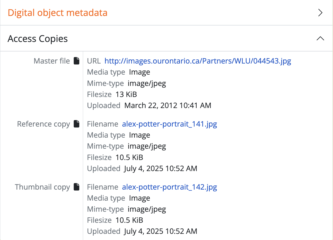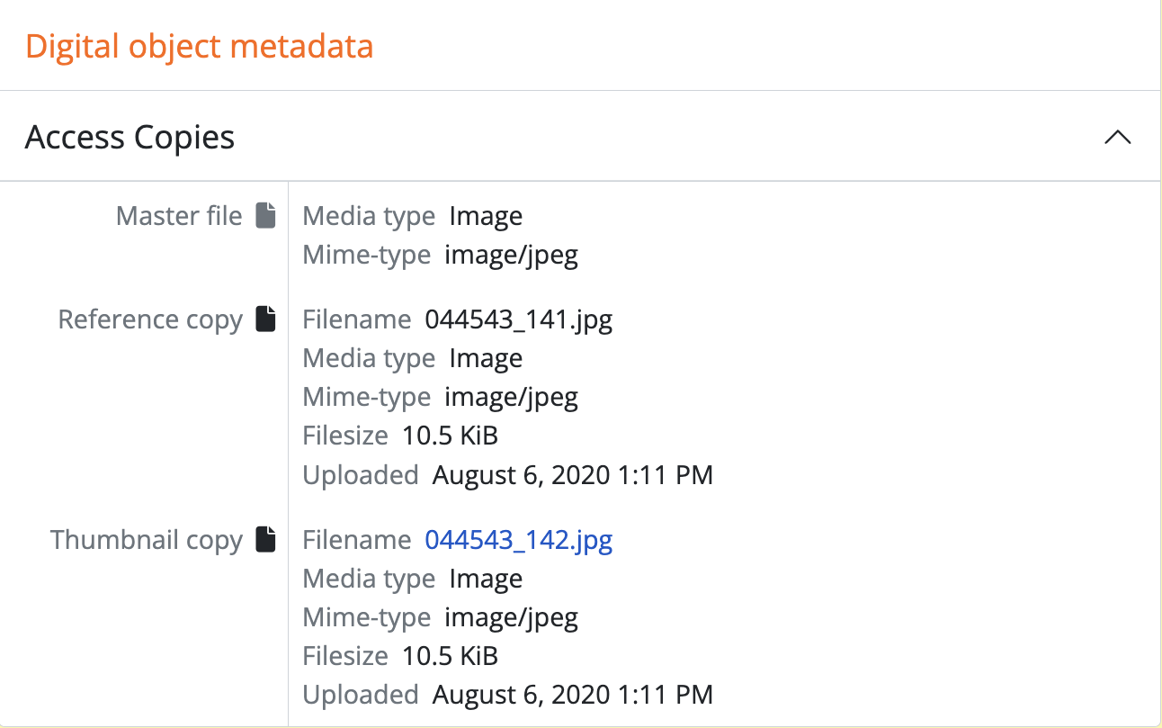 - Clicking on either of these subsection label links will collapse or expand the subsection. See the Digital object metadata above for more about the “Access copies” section.