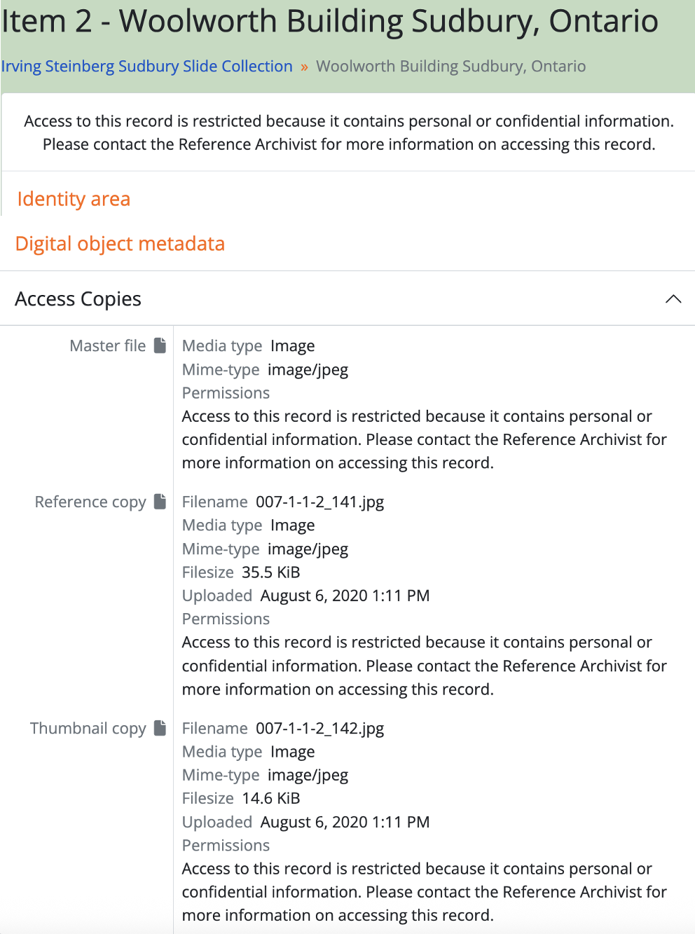 If the “Restriction” were to be changed to “Conditional” and the default permission settings are enabled then the “Reference copy” and “Thumbnail copy” become available again on the AtoM template. The customizable text for the “Condition Statement” is displayed in a “Permissions” field for the “Master file” representation, e.g. “This record has not yet been reviewed for personal or confidential information. Please contact the Reference Archivist to request access and initiate an access review.”.