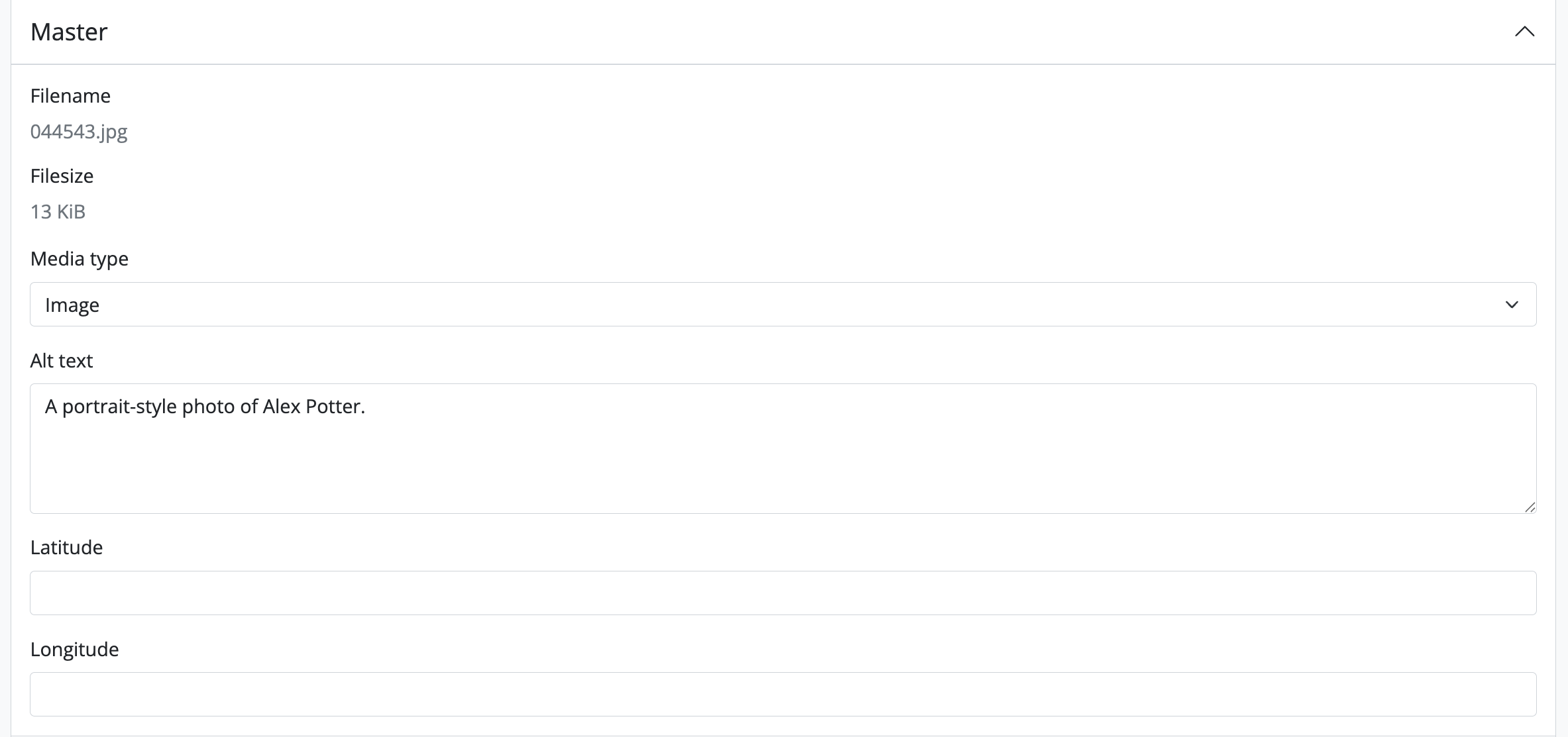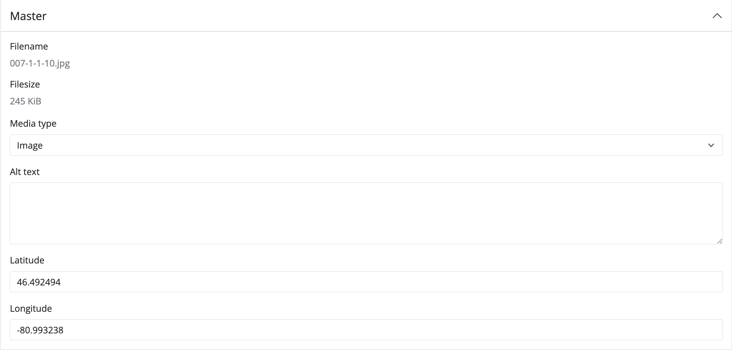 - AtoM will redirect you to the edit page for the digital object. In the information area for the master digital object, add your latitude and longitude values to the fields provided.