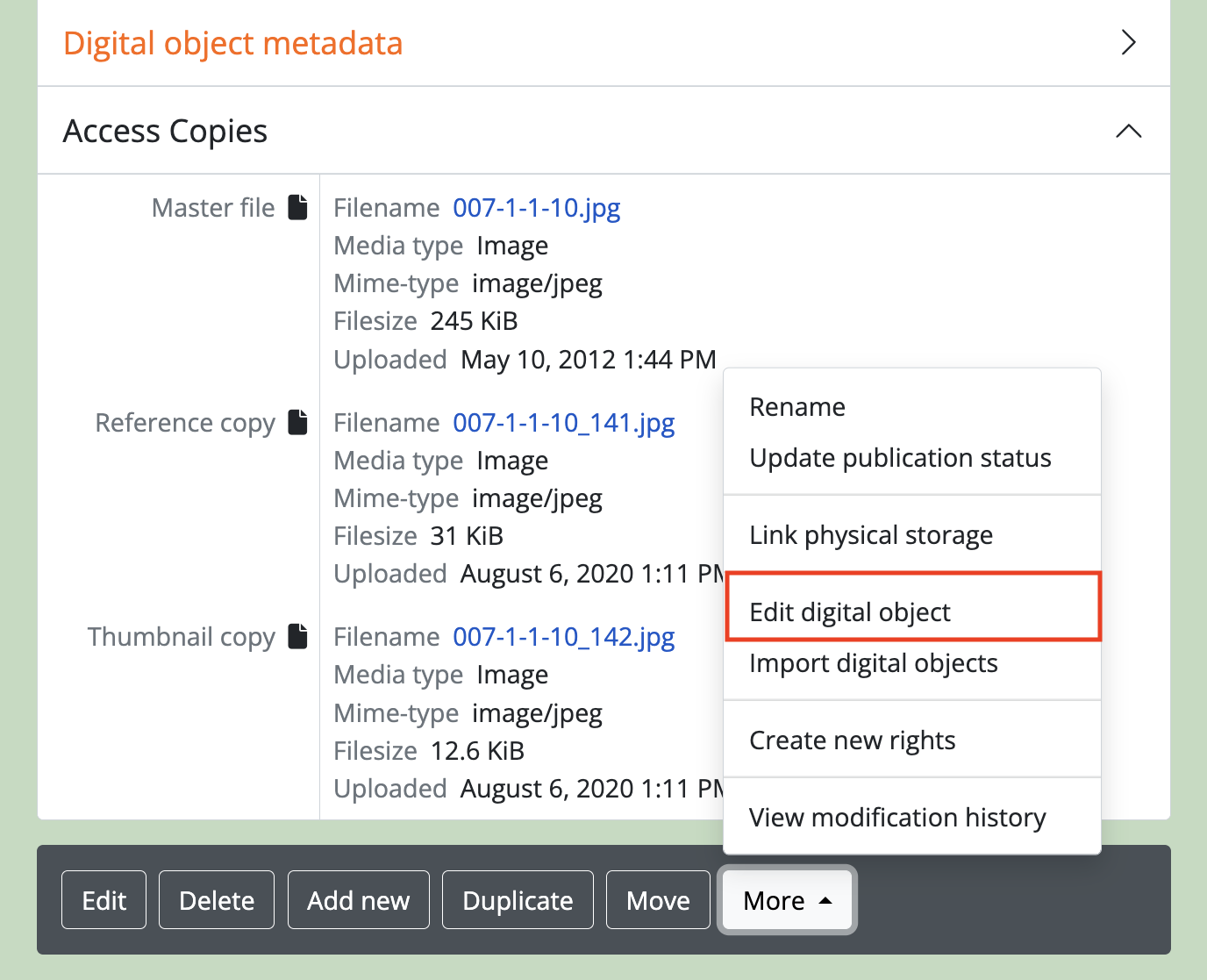 - Click on the “More” button in the button block; from the menu that appears, select “Edit digital object”. You will be redirected to the digital object’s edit page.