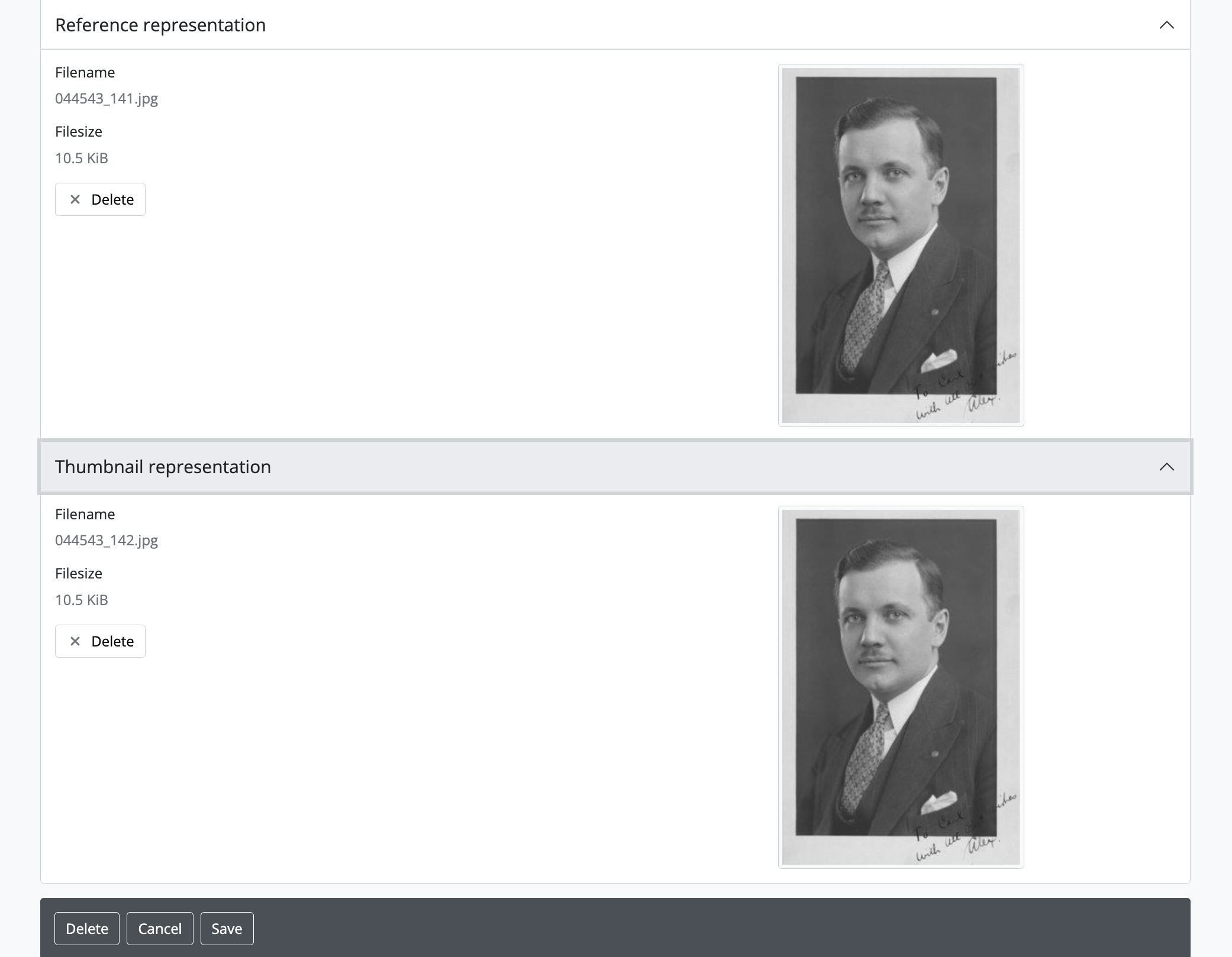 If the Reference representation or Thumbnail representation is deleted via the “Edit digital object” page, then the “Reference copy” and/or “Thumbnail copy” metadata is no longer displayed on the archival description view page. Additionally, the thumbnail is not show on Browse pages and the reference copy is not displayed on view pages.