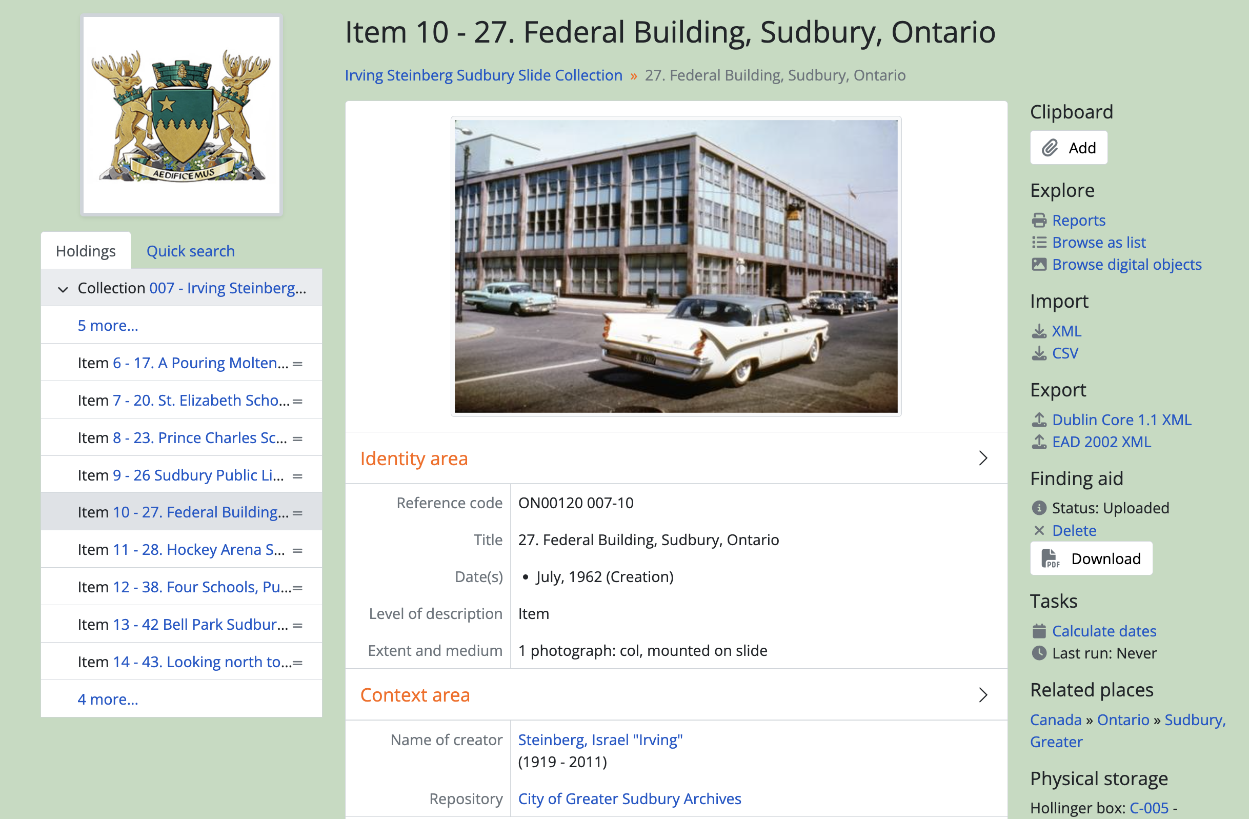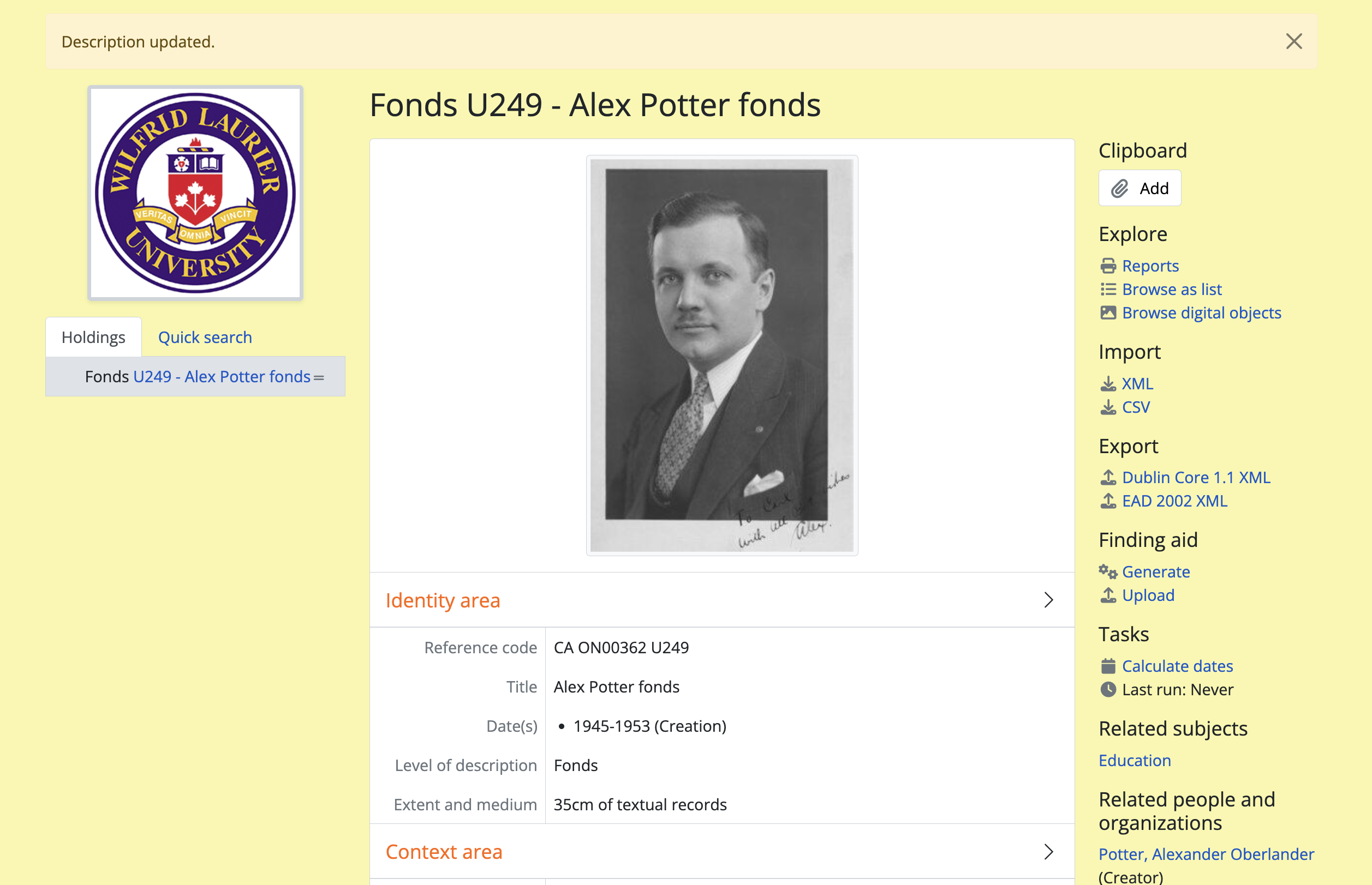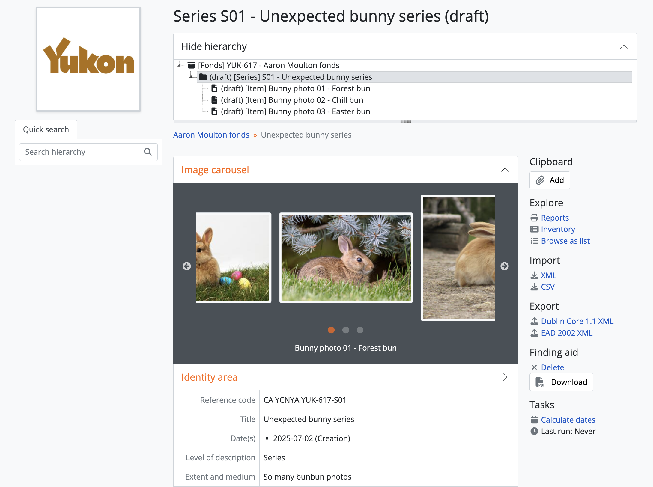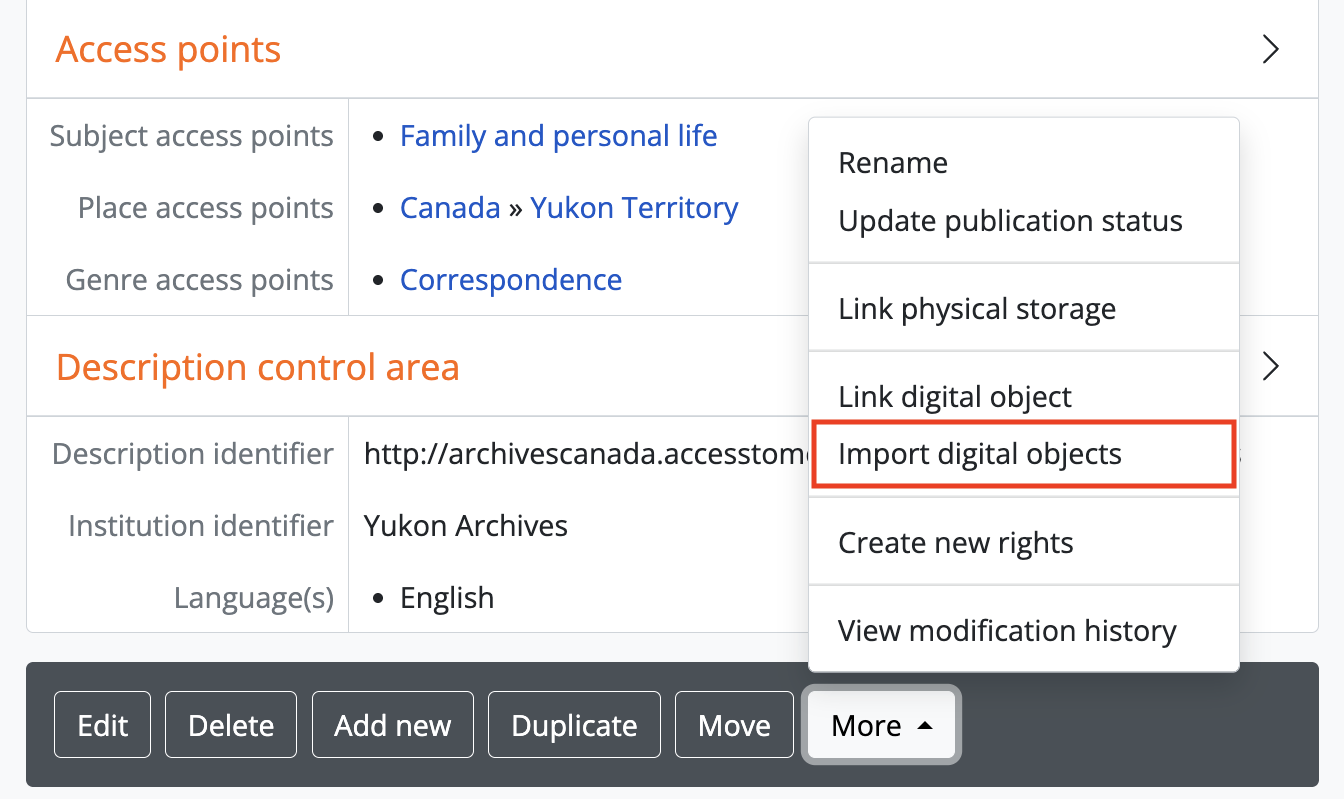 - Navigate to the view page of an existing archival description in AtoM. You can do this by browsing or by searching for a specific archival description - see Access content for more information on navigation in AtoM.
