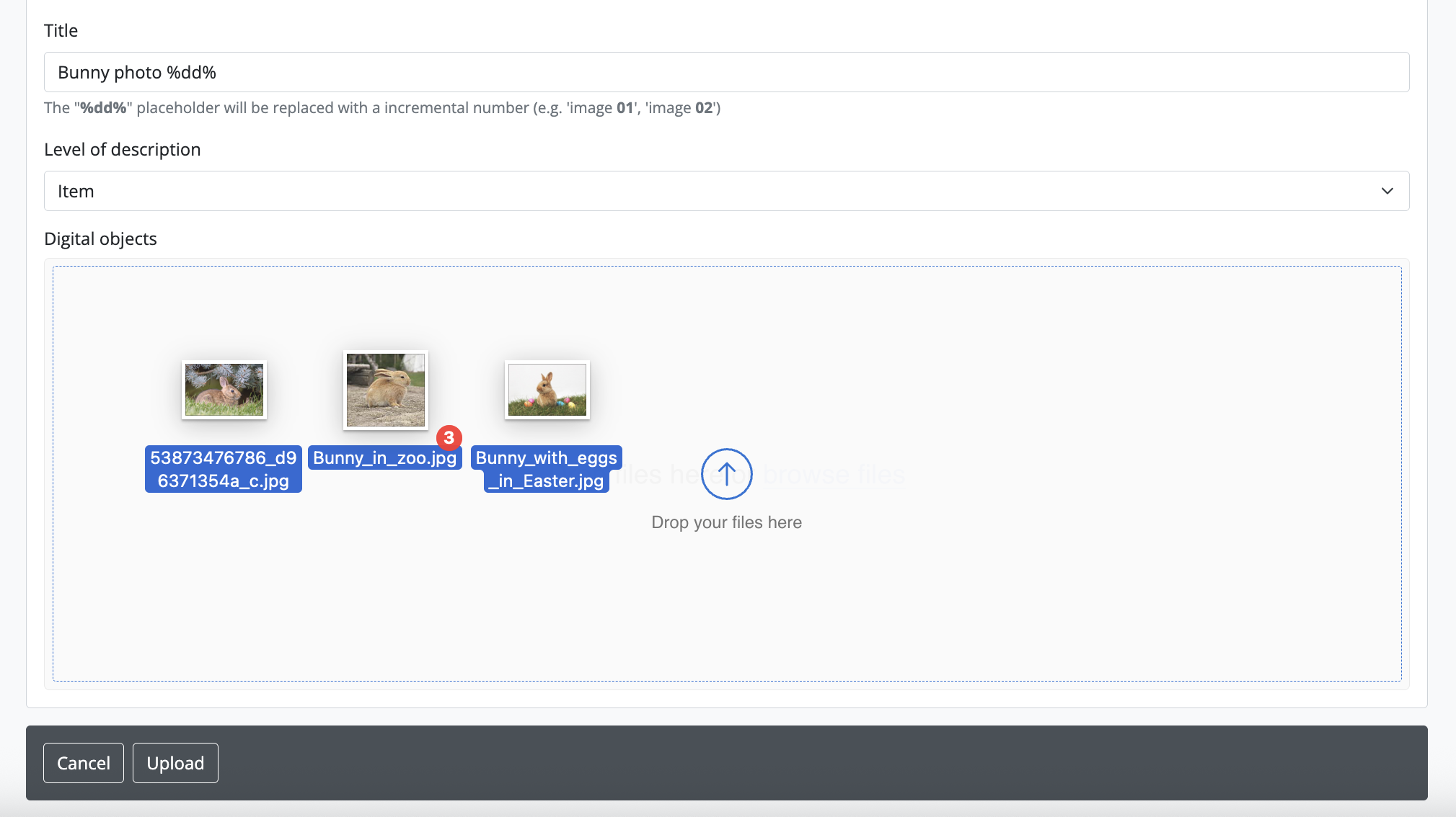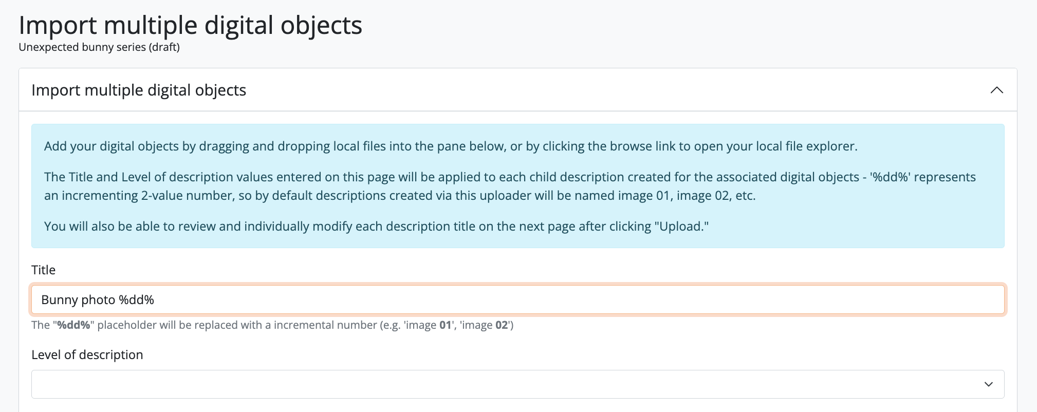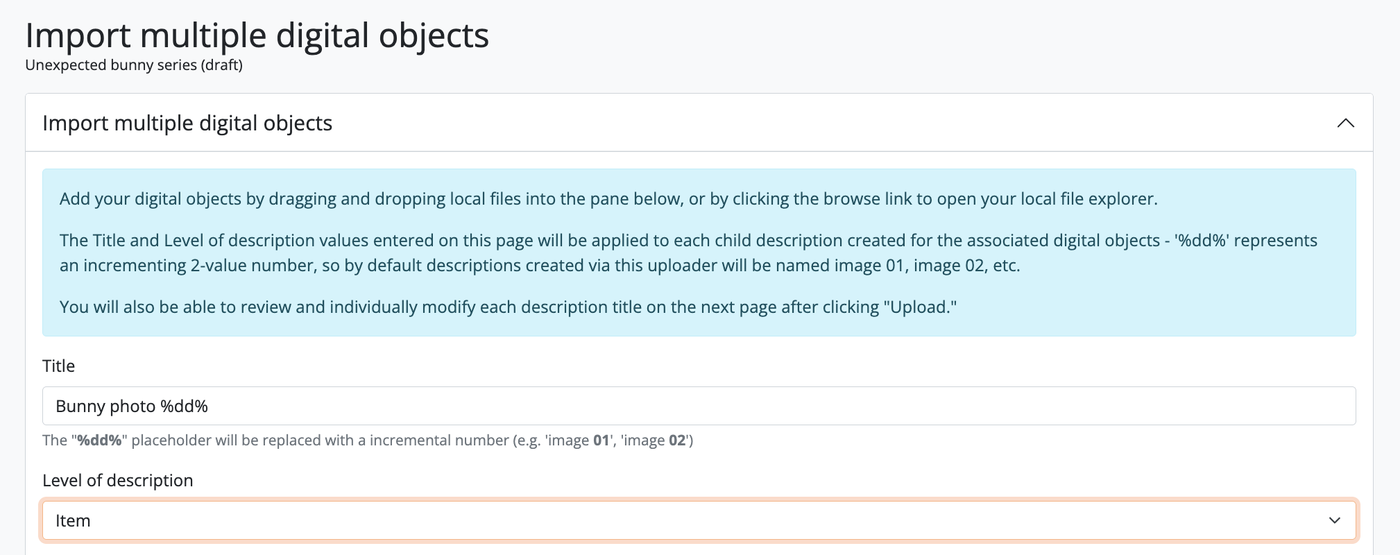 In AtoM, there is a 1:1 relationship between archival descriptions and digital objects - that is, only one digital object may be associated with an archival description, and all digital objects require an associated description. However, to enable a rapid workflow where users can upload multiple digital objects without first having to create associated descriptions, AtoM includes an option to upload multiple digital objects at once, as children of a selected archival description. Users can choose what level of description is used when the placeholder descriptions are created; a title can also be added to each uploaded digital object, which will then be used as the title for the related description.