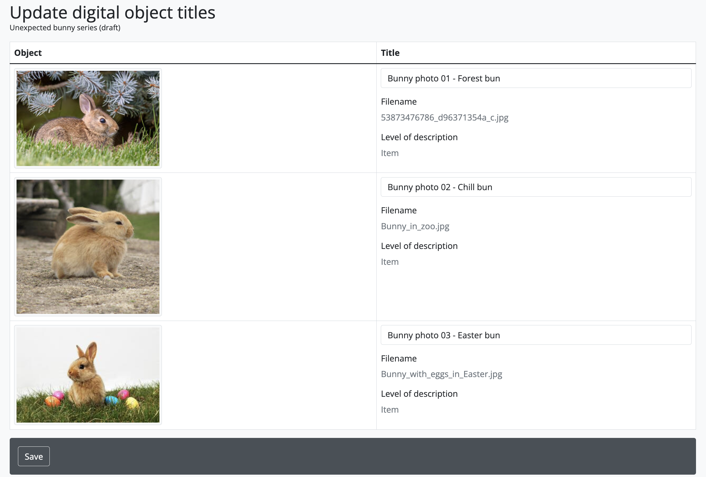 - Click the “Upload” button in the button block when you are satisfied with your changes. AtoM will upload the images using the default description titles provided, but will immediately redirect you to a page where you can individually customize those default titles if desired: