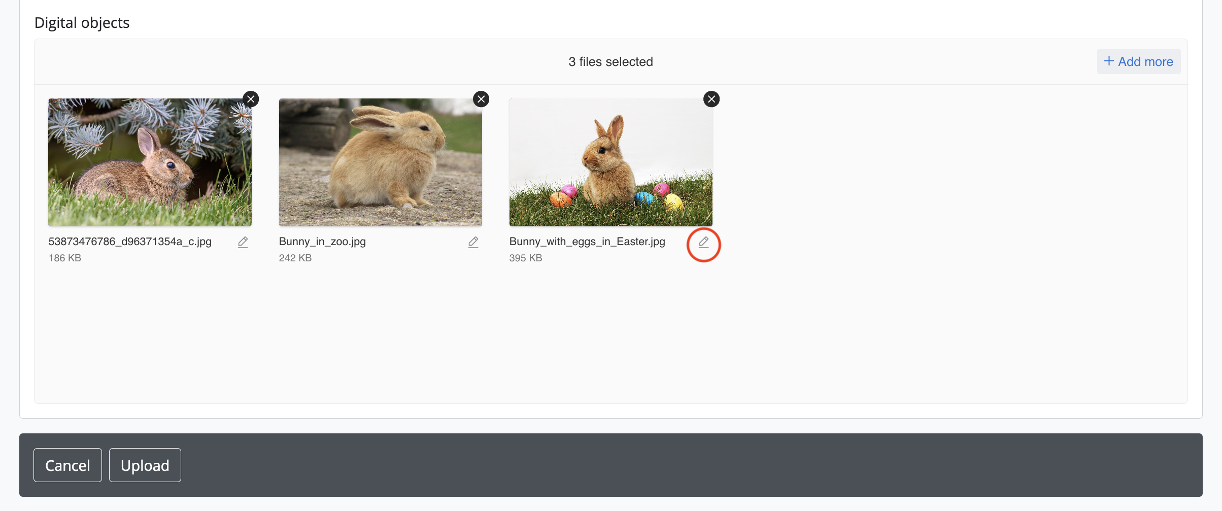 - If necessary, you can click the black “X” icon on the top right of the thumbnail generated to remove an object from the upload. You can also add additional objects either by dragging them in, or by using the “Add more” link provided in the top right corner of the upload area.