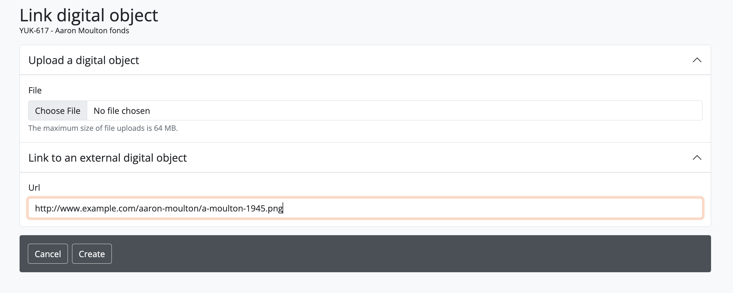 - AtoM will redirect you to the link digital object edit page. Users can either upload a digital object, or link to an existing digital object available on the internet.