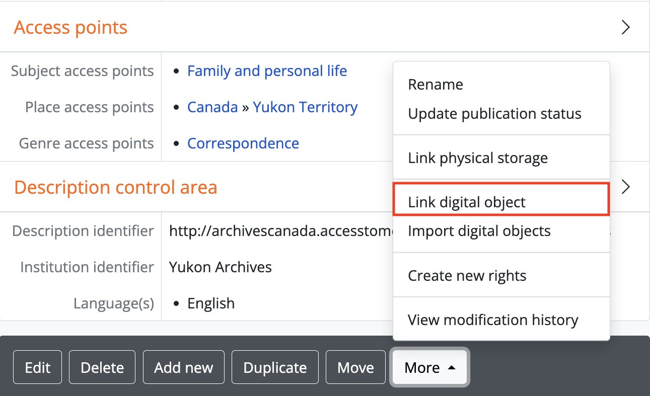 A single digital object can be linked directly to an existing archival description in AtoM via the “Link digital object” option. Users can either upload a digital object, or link to an existing resource available on the web. Instructions on how to do both are included below.