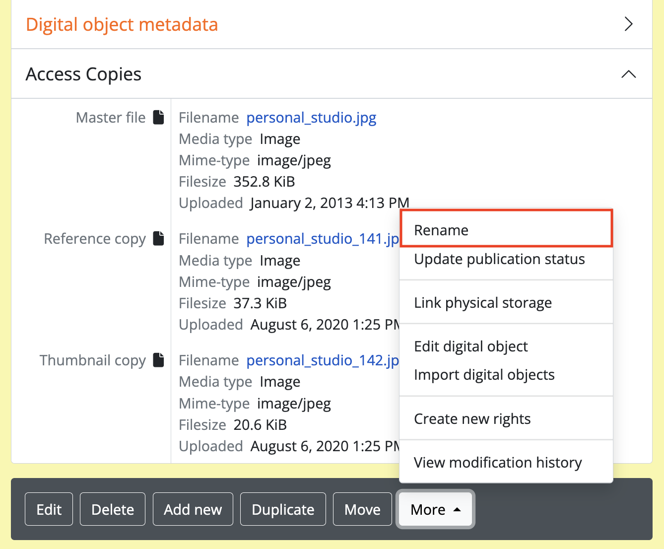 For locally uploaded digital objects, you can edit the file name of the digital object after it has already been uploaded, using the “Rename” module. Once edited, AtoM will automatically update all related file paths to ensure that the link between the digital object and the associated archival description is maintained.