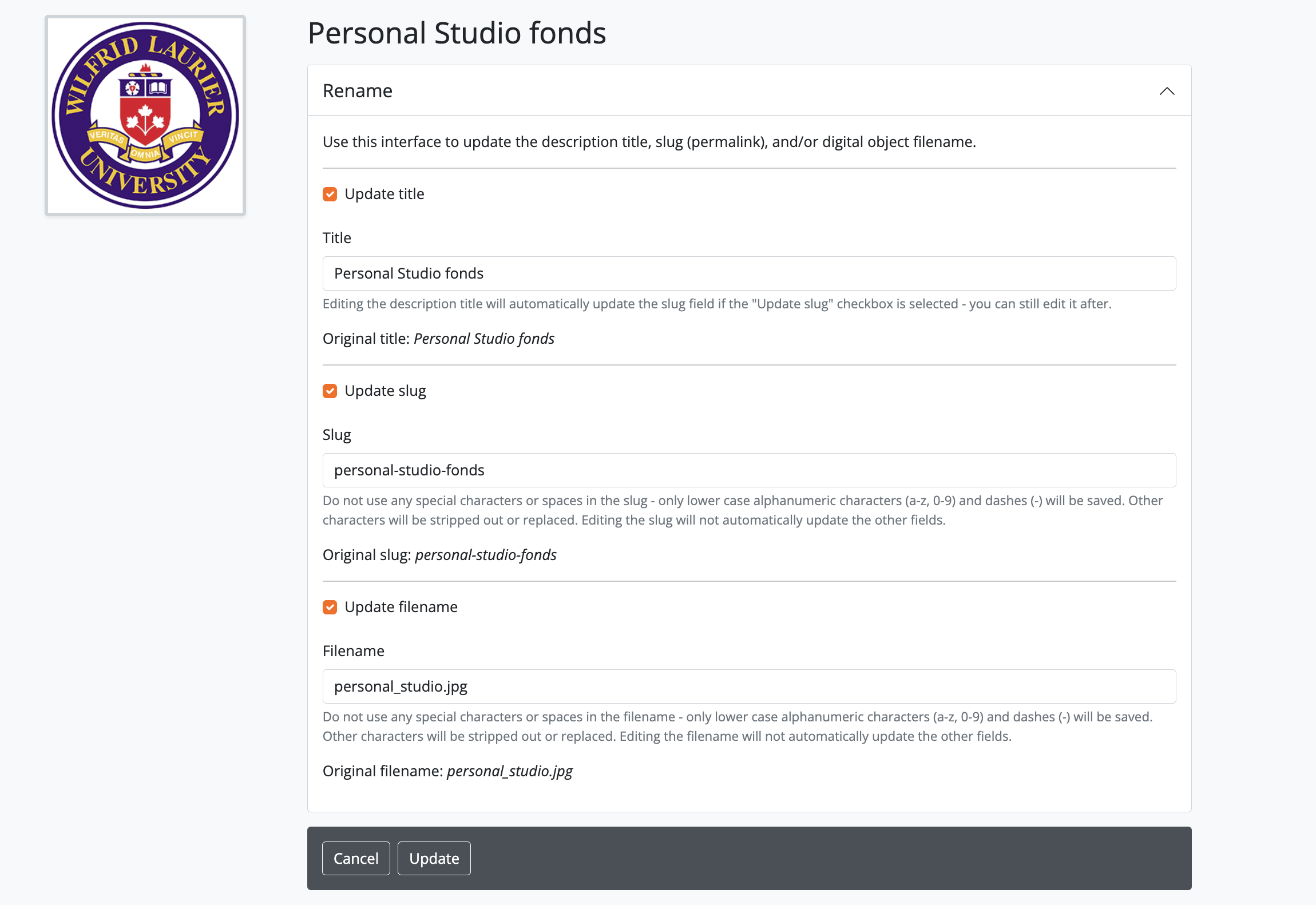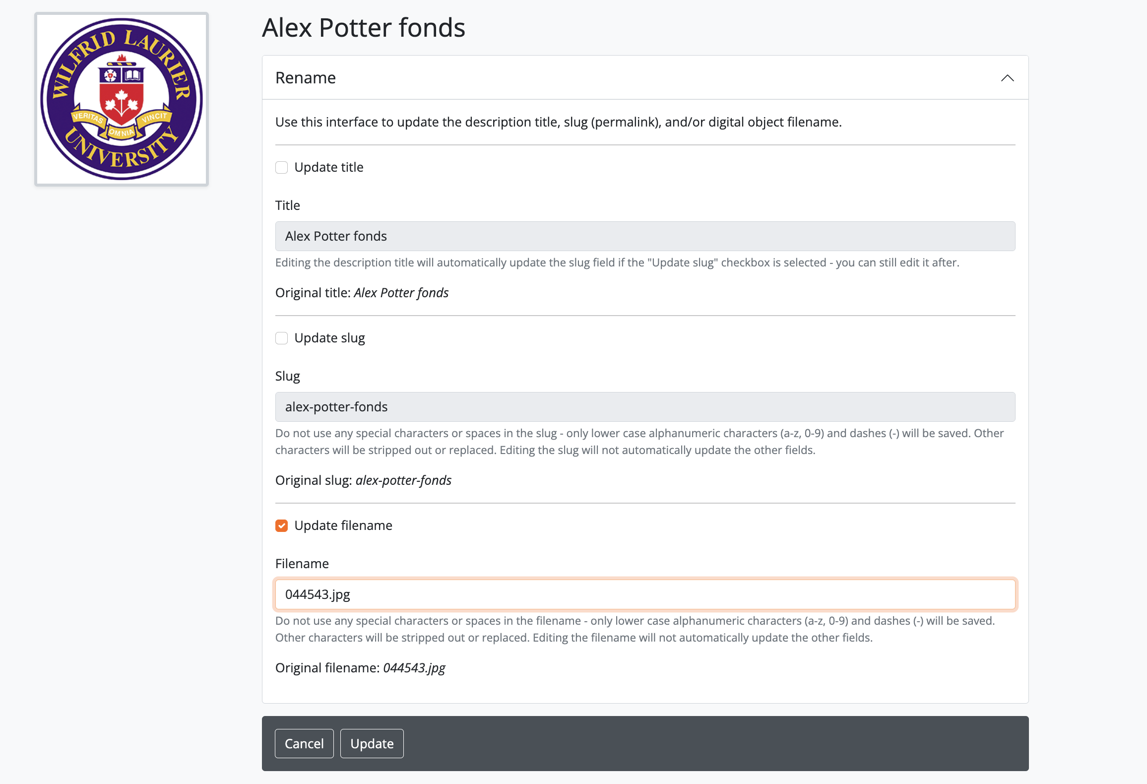 - To the right of the edit fields, there is a checkbox corresponding to each field. By default, the title and slug checkboxes will be checked, and the filename field will be unchecked. The checkbox associated with a field must be checked to enable editing. You can uncheck these fields at any time to disable them - doing so will undo any changes made and prevent the field from updating when the “Update” button is clicked. To edit the filename of the linked digital object, check the “Update filename” box. You also might wish to uncheck the Title and Slug boxes, to prevent any accidental edits.