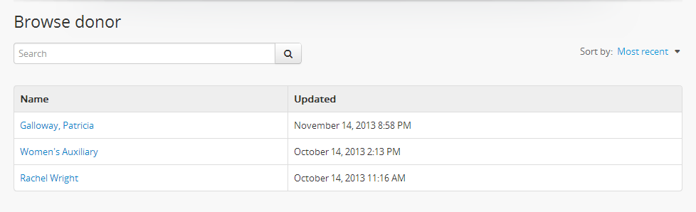 Donors. - AtoM will redirect you to the Donors browse page. A list of your donor records will appear; if there are more than 10 results, a pager will be included. To begin searching for a donor record, place your cursor in the the dedicated search box at the top of the Donors browse page.
