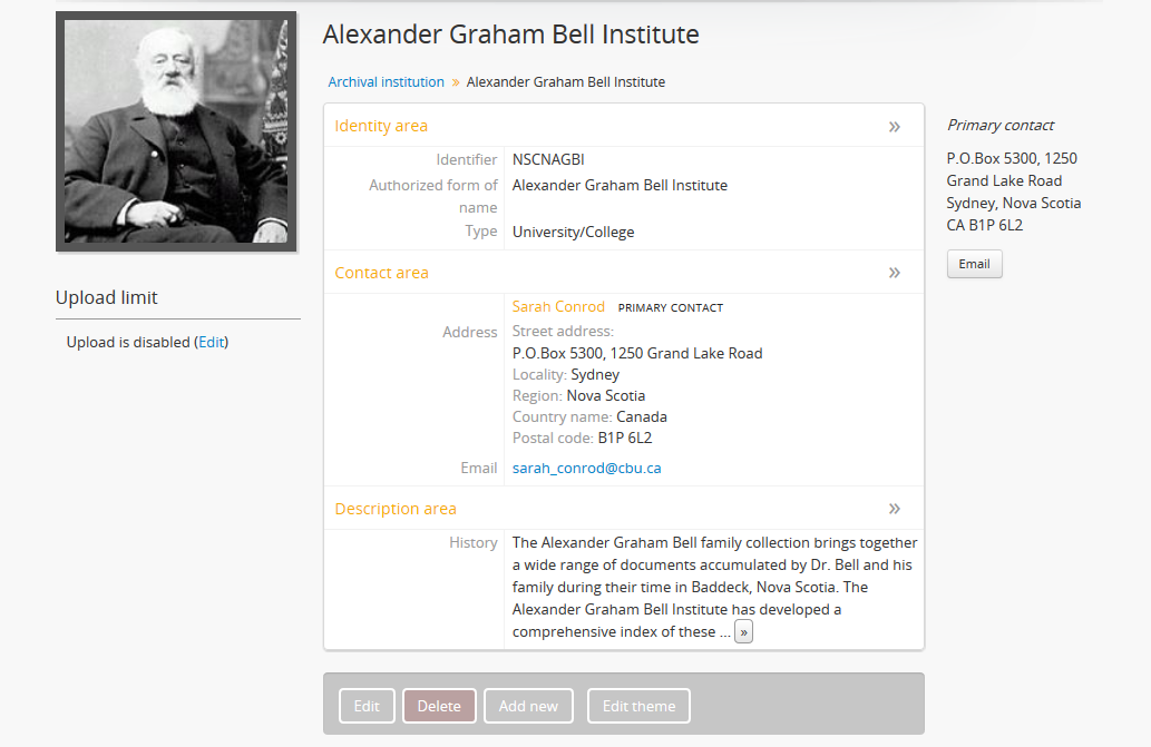 The newly created archival institution will then have to be edited to include necessary data. To edit the archival institution record, see the Edit an existing archival institution section of this page.