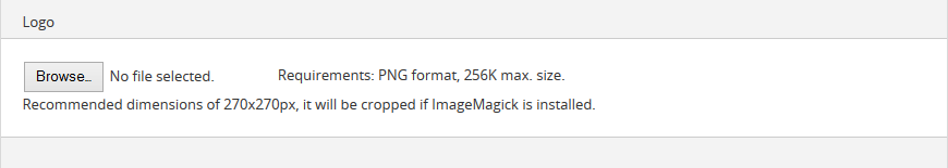 AtoM requires that the image uploaded as the institution logo be in PNG format. The image cannot exceed 256k in size. If the image selected for upload does not meet these requirements, you will receive an error message below the “Logo” field after clicking the “Save” button, and your upload will not be saved.