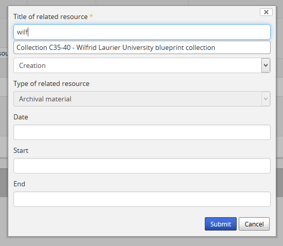 - The first field in the pop-up dialog, “Title of the related resource,” is an auto-complete field: as you type, matching results will load in a :term :drop-down menu below the field. When you see the archival description you would like to link, click on it to select it.