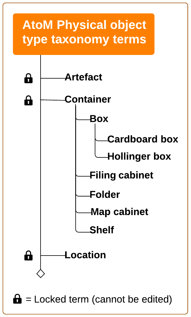 The default hierarchy in the Physical Object type taxonomy in AtoM is as follows: