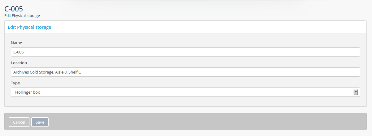 The intended use is for “Containers” to include specific storage containers, such as box numbers, cabinet drawers, etc., and for “Locations” to include more general storage locations, such as “Cold storage,” “Vault,” etc. Storage types and uses can be customized to meet institutional practices, however in order to link a custom storage container to a new or existing archival description you must nest the storage container under “Container.”