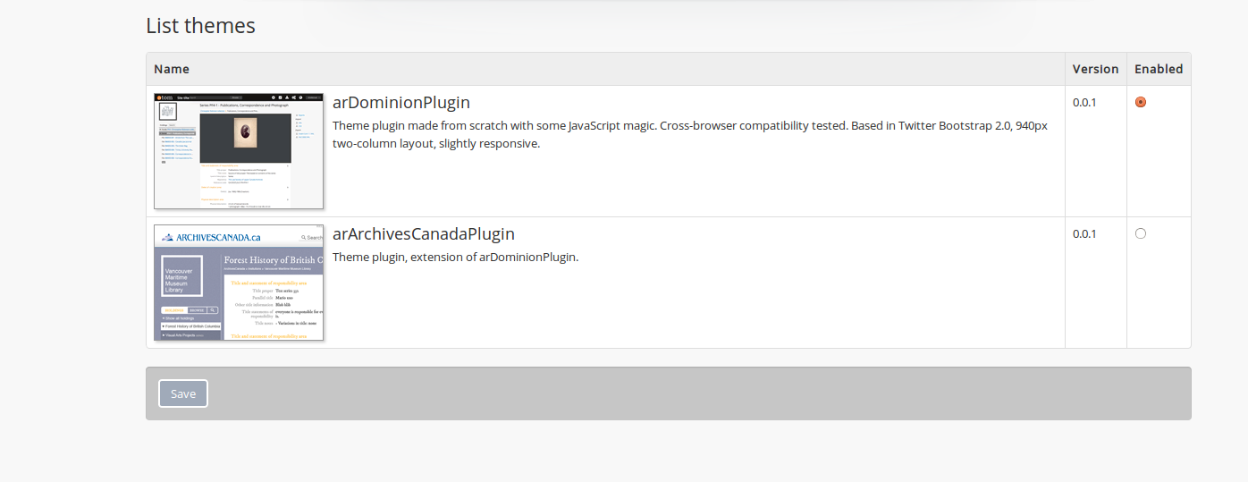 1. Click on the radio button in the “Enabled” column for the theme you wish to have enabled and click “Save.”