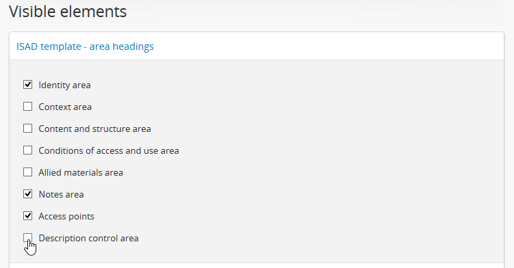An authenticated (logged-in) administrator can check check the checkboxes to reveal the field, while an uncheck unchecked box hides the field. To review which fields can be hidden from the public, select the ISAD template and /or the RAD template as applicable. Whether you hide/show elements from the ISAD or RAD area depends on which default template you are using.